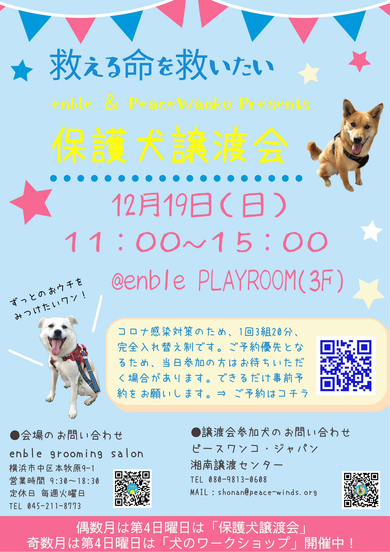 【ピースワンコの譲渡会】12/19(日)「enble 保護犬譲渡会」開催(神奈川)