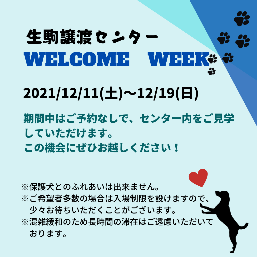 生駒譲渡センターでは12月11日(土)~19日(日)の期間中【Welcome WEEK】を開催いたします
