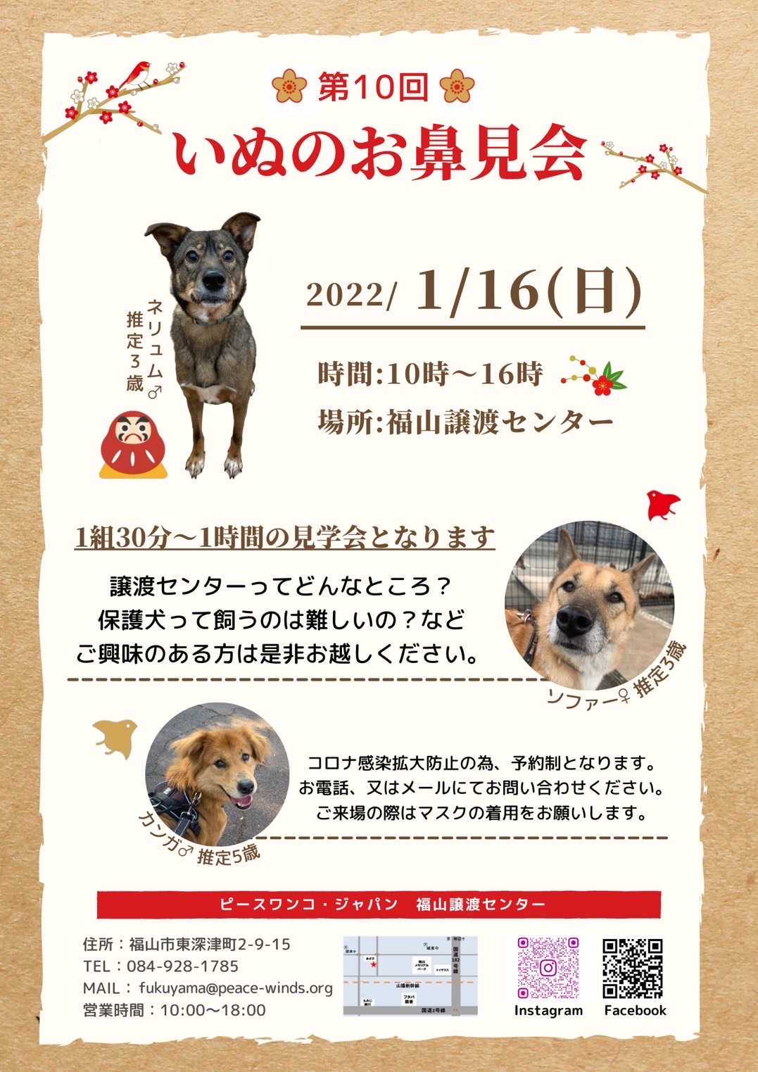 1月16日(日)、ピースワンコ・ジャパン福山譲渡センターで「いぬのお鼻見会」を開催します。センターに在籍しているワンコ達を見学して頂き、保護犬を知っていただく機会にしていただきたいと思います。今回は神石高原シェルターで里親募集をしているワンコも参加します!この機会に是非お越しください。