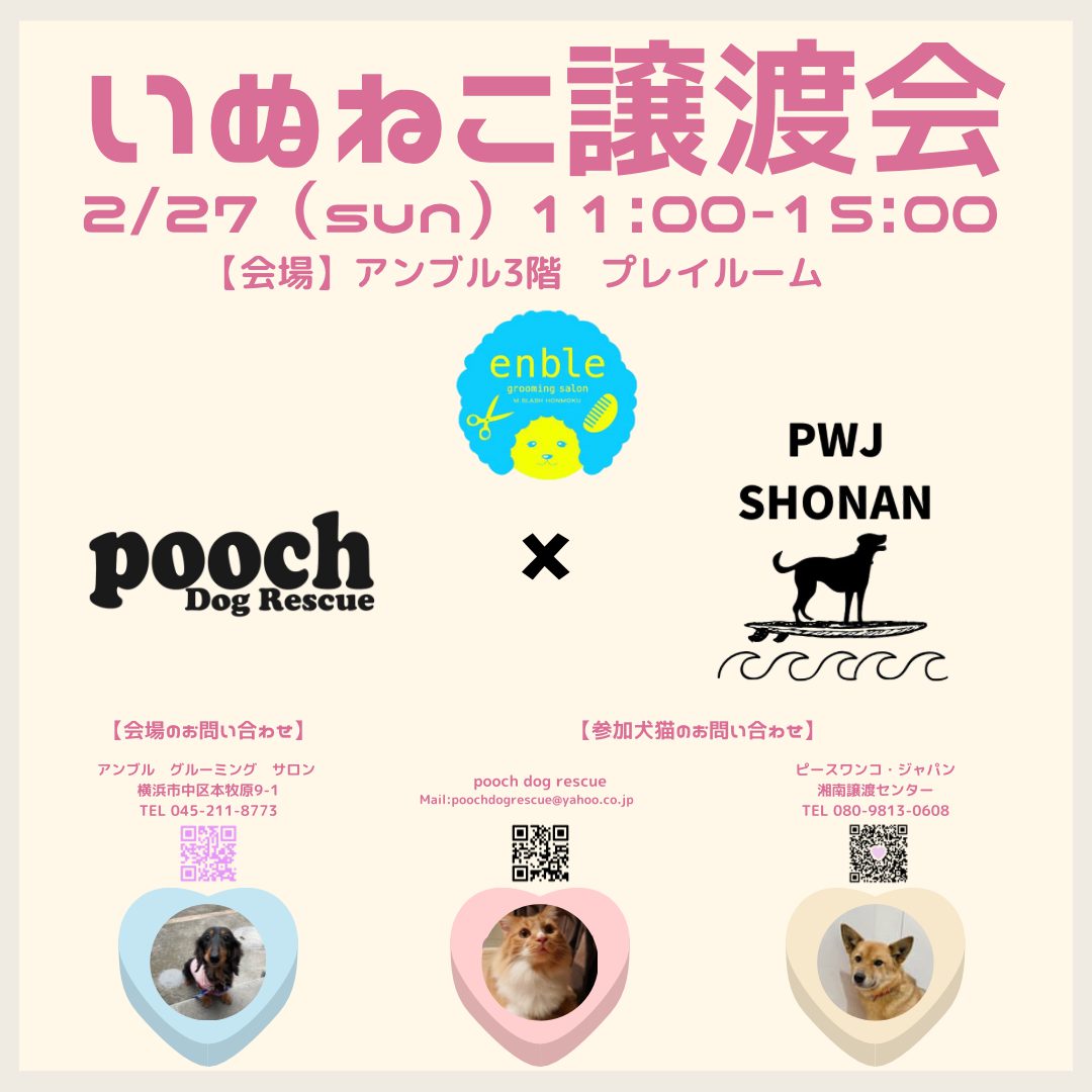 2月27日(日)、コロナ感染防止対策のもと横浜本牧のドッググルーミングサロン「enble(アンブル)」プレイルームで「いぬねこ譲渡会」を開催し、pooch dog rescue様と湘南譲渡センターの里親募集中のワンコ・ネコが参加します。一頭でも多くのワンコ・ネコが家族に出会えるよう、お近くの方はぜひご来場ください。ご予約優先となるため、当日参加の方はお待ちいただく場合がありますので、できるだけ事前予約をお願いします。