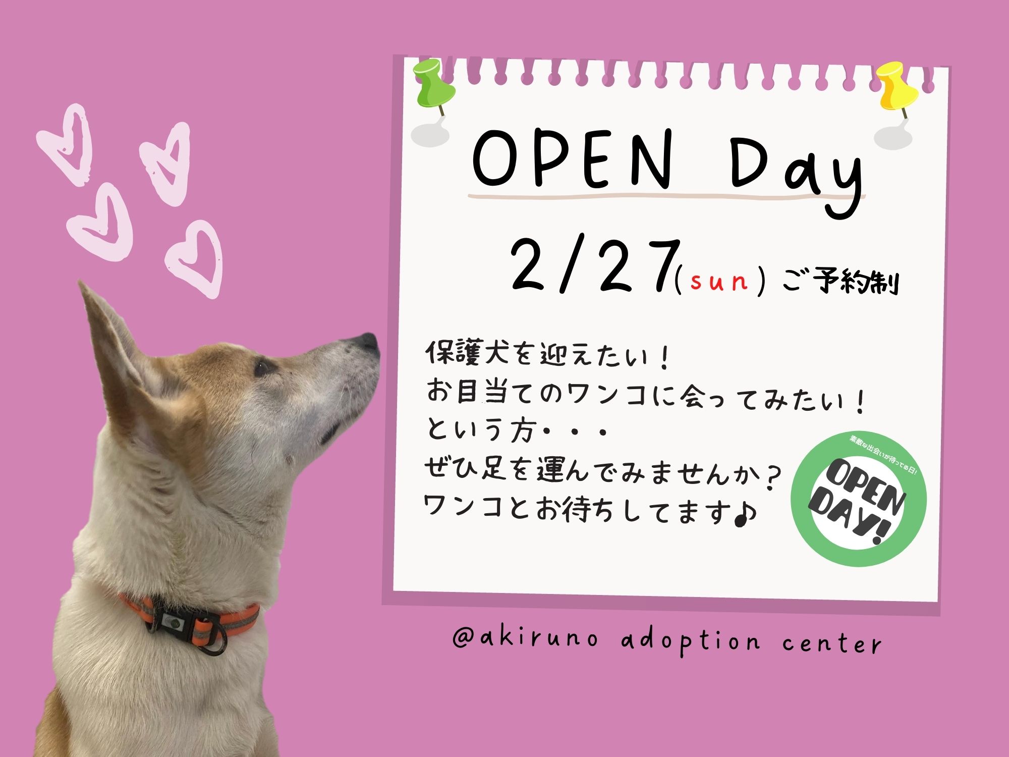 2月27日(日)、あきる野譲渡センターのワンコに会っていただきやすくするために「OPEN Day 第17弾」を開催します。