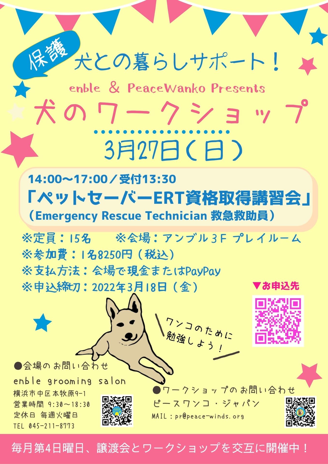 【ピースワンコのイベント】3/27(日)「enble犬のワークショップ/ペットセーバーERT資格取得講習会」開催(神奈川)