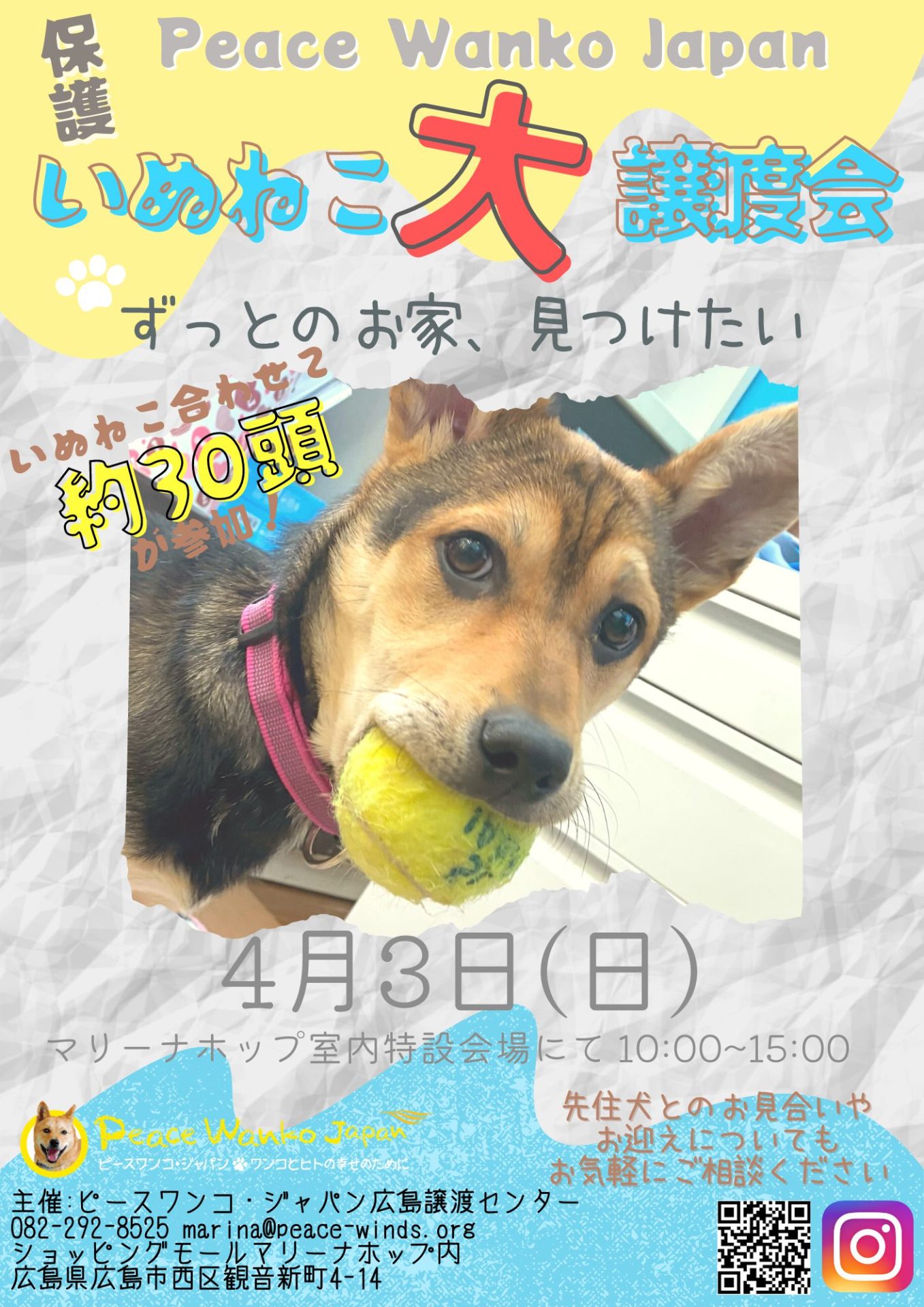 広島マリーナホップにて、定期的に「保護犬猫の家族を探す会」を行います。