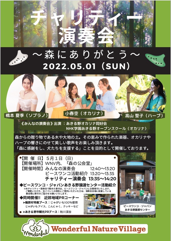 5月1日(日)にわんダフルネイチャーヴィレッジでチャリティー演奏会「森にありがとう」が開催されます。本イベントは「森に感謝をし、犬たちを支援する」ことを目的としたイベントで、森の恵みで作られた楽器オカリナやハープの響きに乗せて、美しい歌声で綴る演奏会です。あきる野譲渡センターからワンコとスタッフも参加し、保護犬のことや私たちの活動について紹介させていただきます。