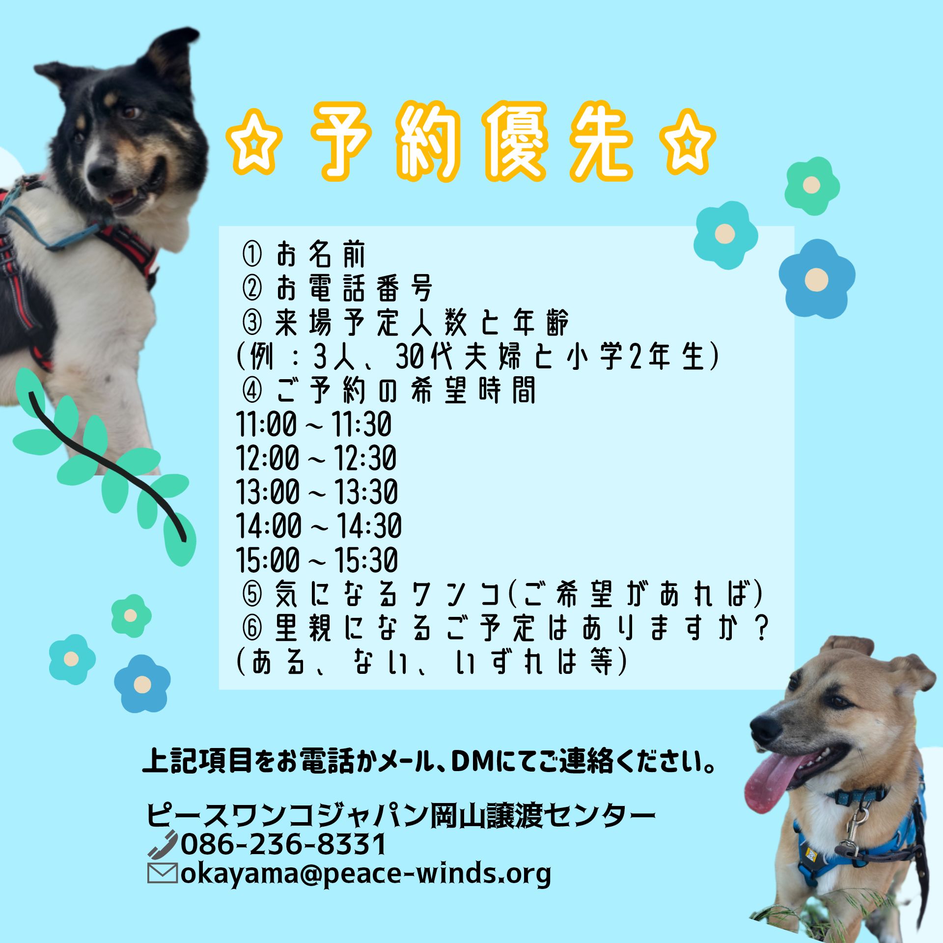 ※ワンコの体調等考え、一組様30分までとさせて頂きます。 (その後、犬舎内のご見学も可能ですが、他のお客様と重なる場合はお待ちいただく可能性もあります)