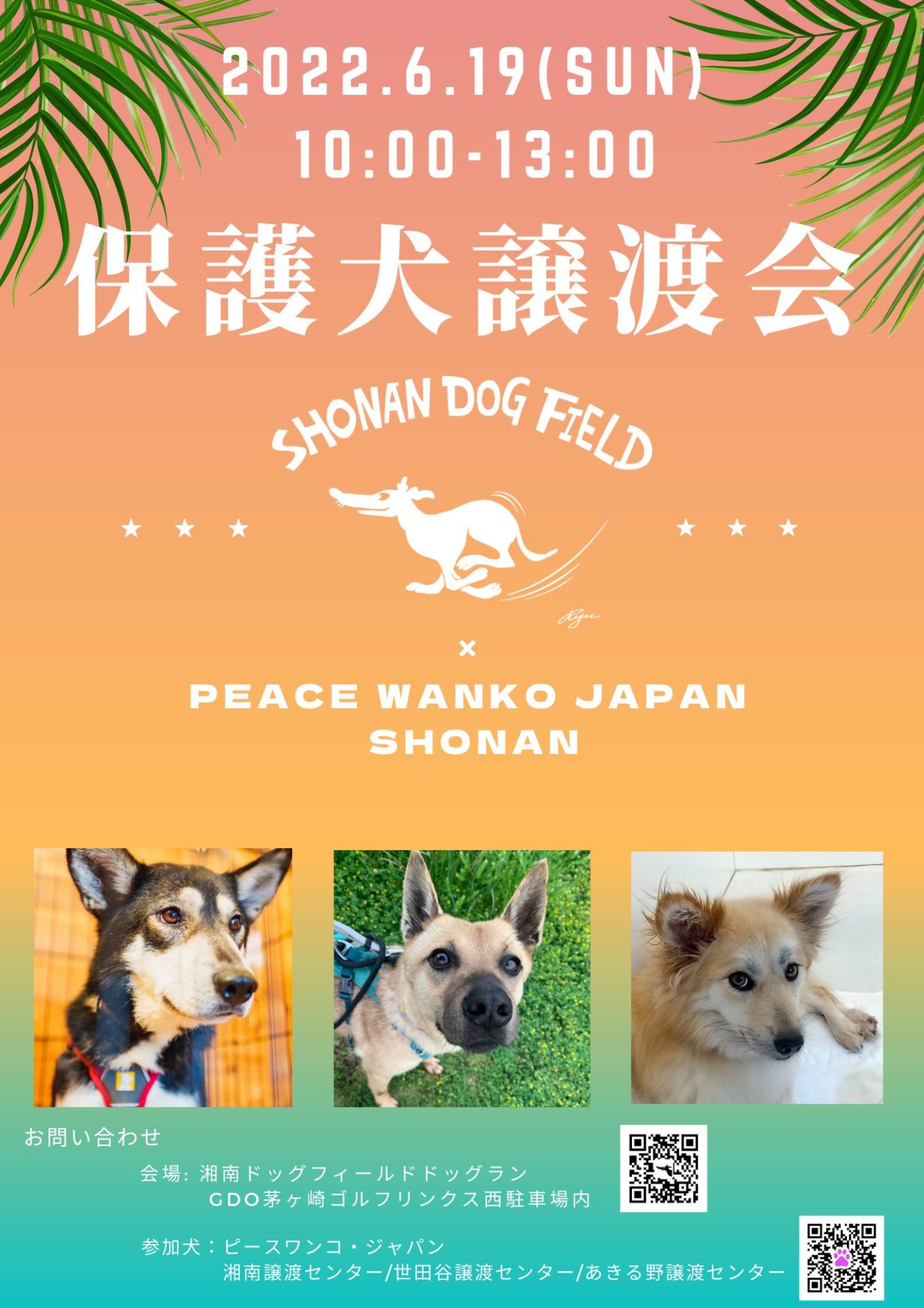 6月19日(日)、コロナ感染防止対策のもと神奈川県茅ヶ崎市の「湘南ドッグフィールド、ドッグラン」で「保護犬譲渡会」を開催し、湘南譲渡センター世田谷譲渡センターあきる野譲渡センターの里親募集中のワンコが参加します。一頭でも多くのワンコが家族に出会えるよう、お近くの方はぜひご来場ください。