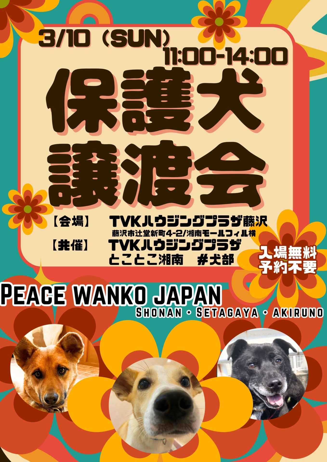 3月10日(日)、TVKハウジングプラザプラザ藤沢にて、【とことこマルシェ #犬部】に参加いたします。ピースワンコ・ジャパン湘南譲渡センター、世田谷譲渡センター、あきる野譲渡センターのワンコ達の保護犬譲渡会に是非ご参加ください。一頭でも多くのワンコが家族に出会えるよう、お近くの方はぜひご来場ください。