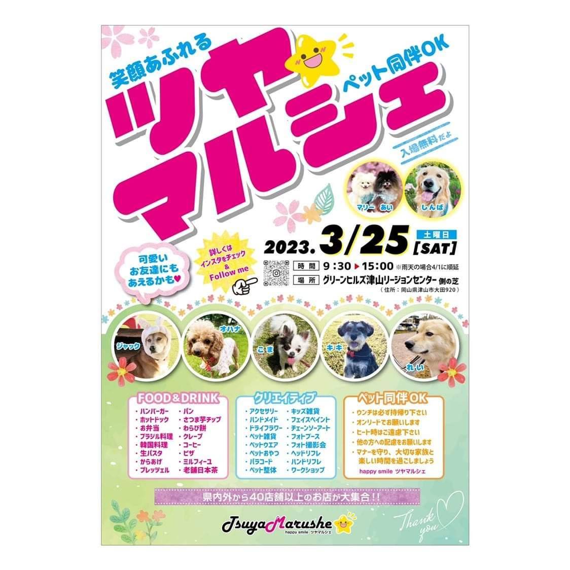 3月25日(土)、岡山県津山市のグリーンヒルズ津山にて開催の「ツヤマルシェ」にピースワンコから譲渡会として初参加させて頂きます!