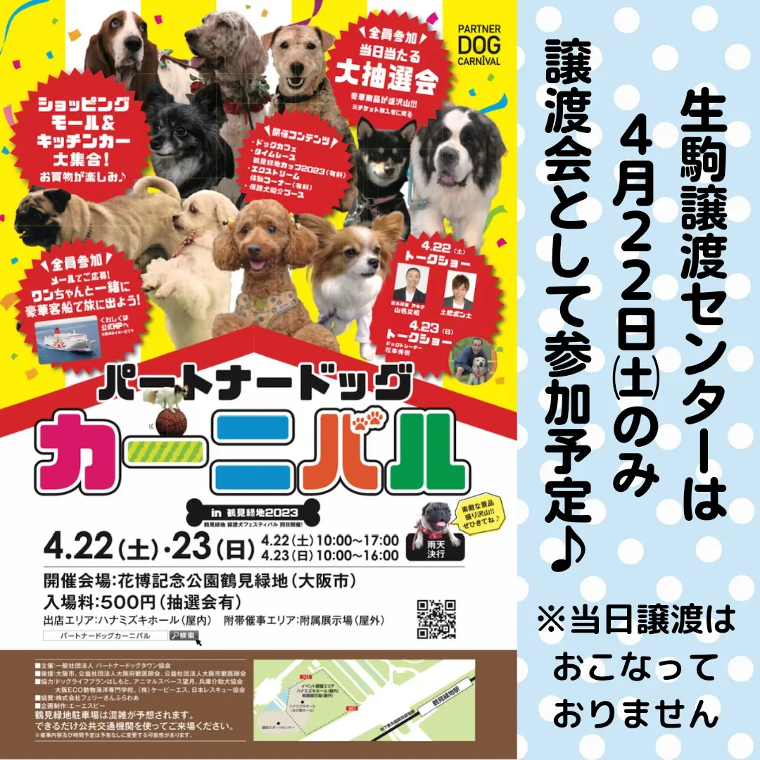 - 2023年4月22日(土) 10:00~17:00 ◎雨天決行 イベントは22日、23日と二日間開催していますが、譲渡会としてセンターが参加するのは22日のみとなります。