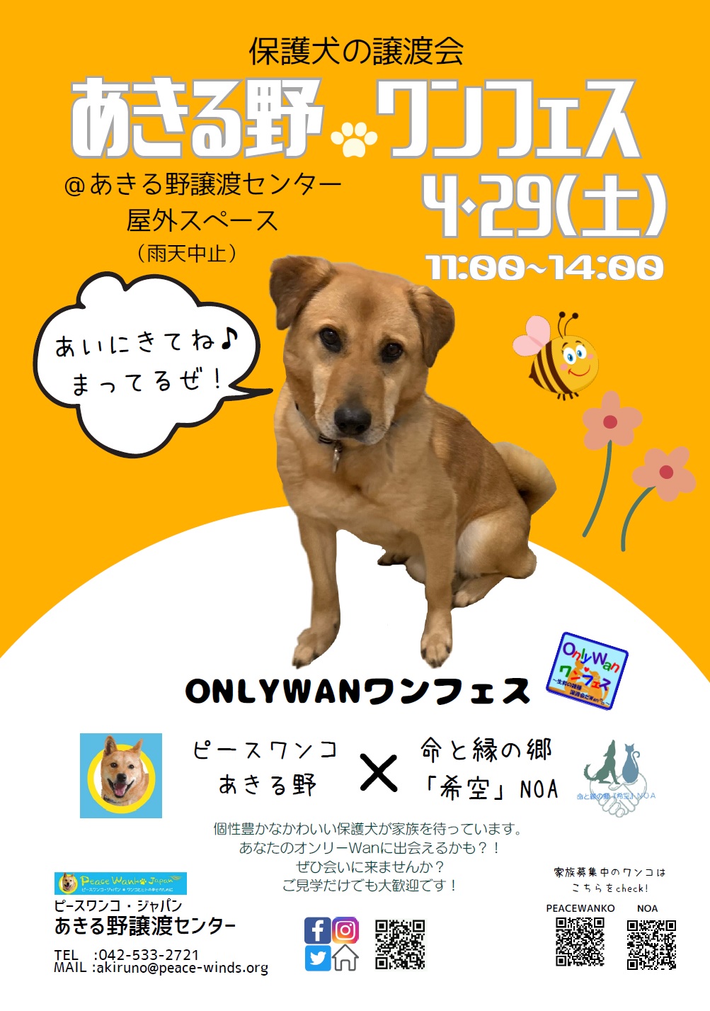 4月29日(祝/土)、あきる野譲渡センターで犬の譲渡会「Only Wan ワンフェス」を開催します。個性豊かで愛嬌たっぷりなワンコたちの中から、あなたの「オンリーワン」と出会う場所になるよう、スタッフがサポートします。