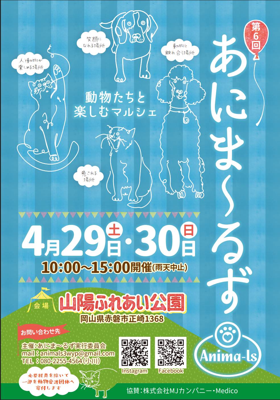 4月29日(土)、岡山県赤磐市の山陽ふれあい公園にて開催の「第6回あにま~るず 動物たちと楽しむマルシェ」に岡山譲渡センター・神石高原シェルターで里親募集中のワンコ数頭が参加します。
