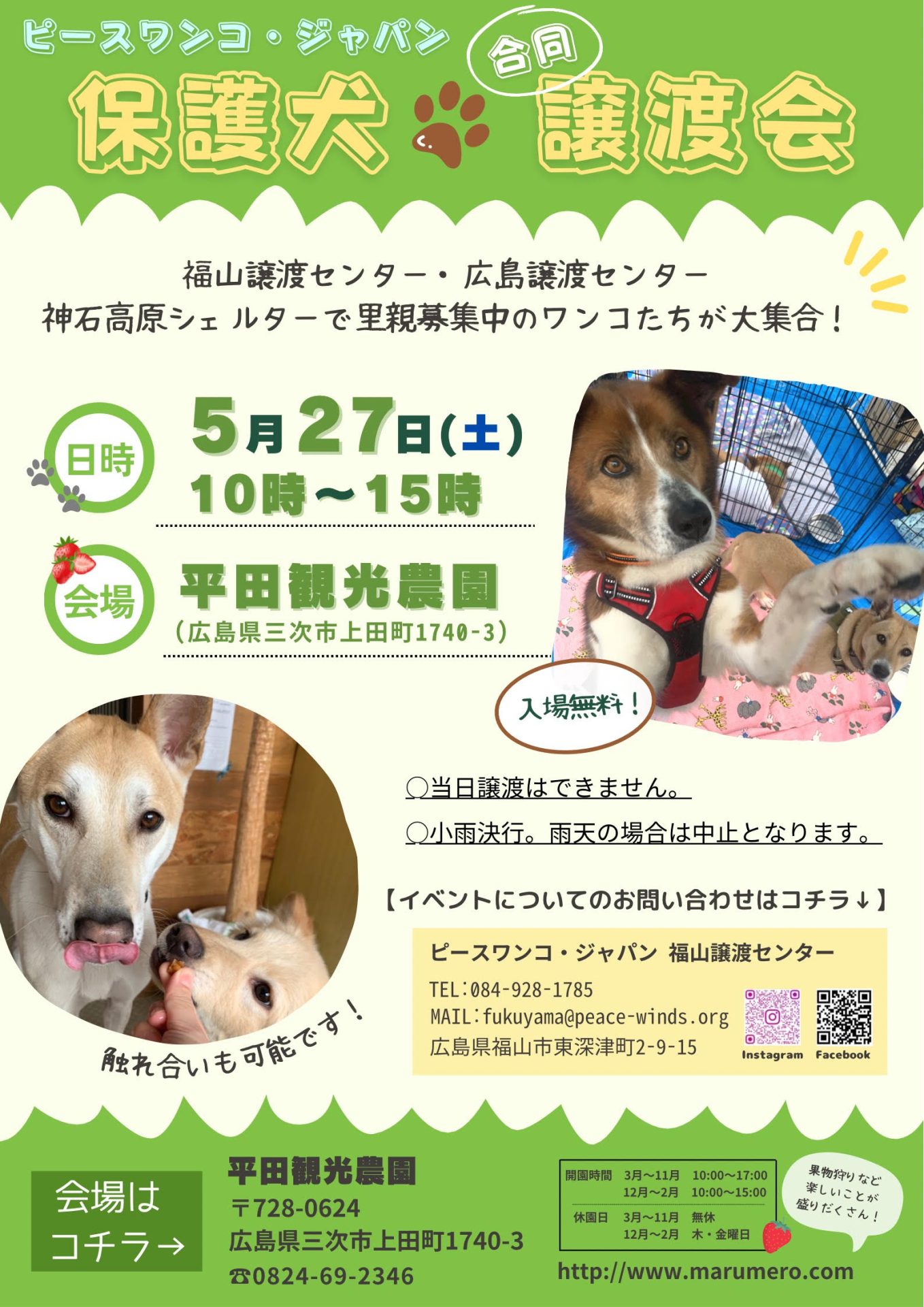 5/27(土)に広島県三次市の「平田観光農園」様にて福山譲渡センター、広島譲渡センター、神石高原シェルターで合同譲渡会を開催いたします!自然豊かな会場に総勢12~15頭のワンコがやってきます。入場無料となっておりますので、お気軽にお越しくださいませ。皆様のご参加をお待ちしております!