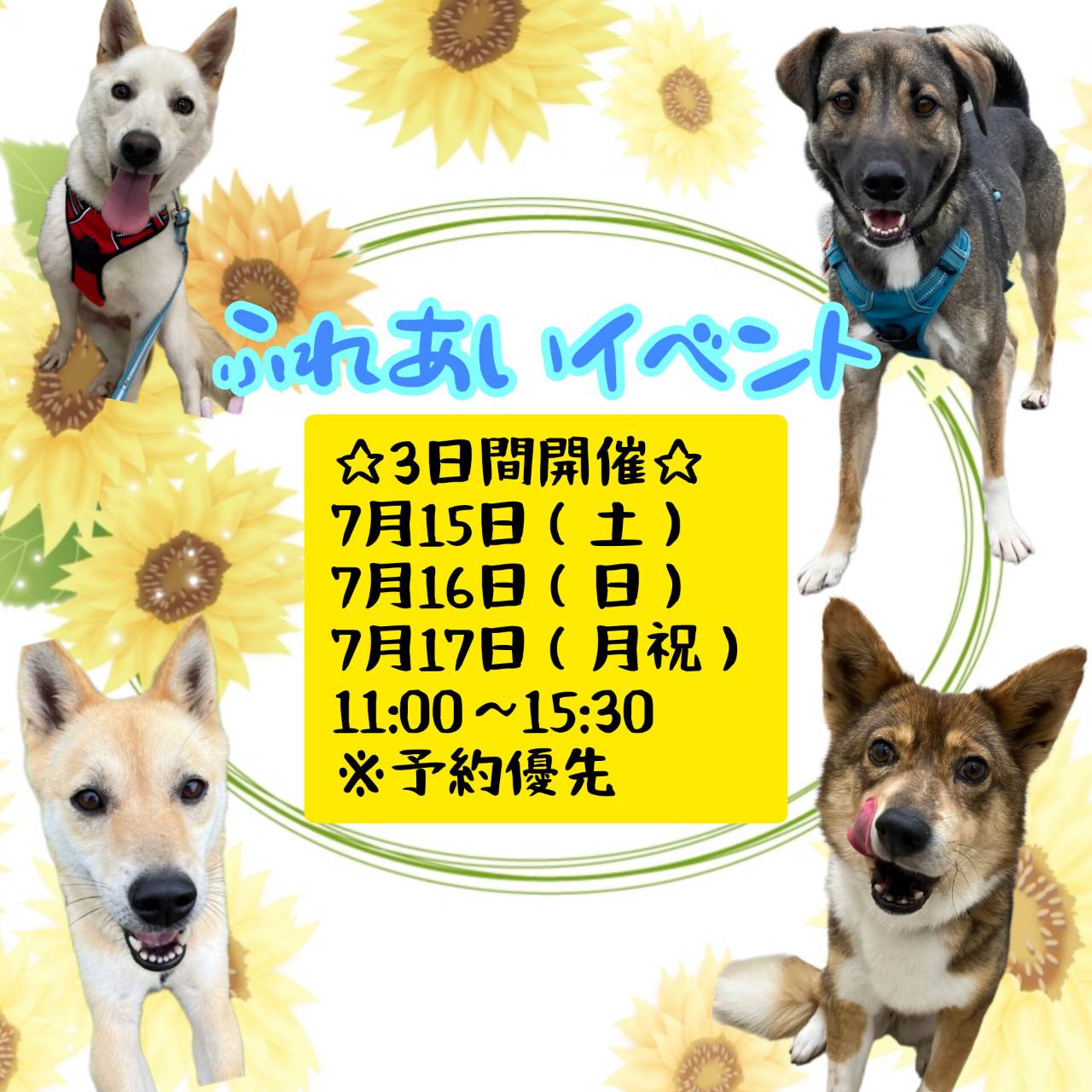 今回は、7月の三連休で開催いたします。気になるワンコがいる方、保護犬について知りたい方、ボランティアに興味がある方、恥ずかしがり屋のワンコ達とふれ合ってみたい方…等々、少しでもご興味がある方は、お気軽にお越しください。
