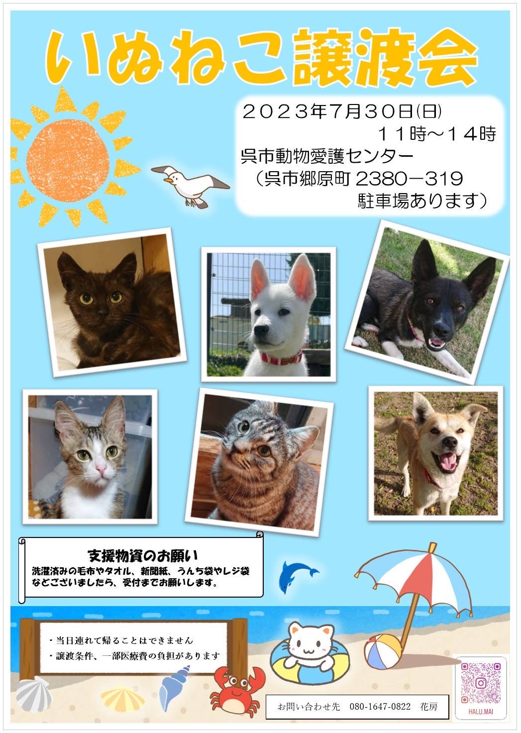 7月30日(日)に呉市動物愛護センター様にて開催される「いぬねこ譲渡会」に、ピースワンコの保護犬たちも参加させていただきます!