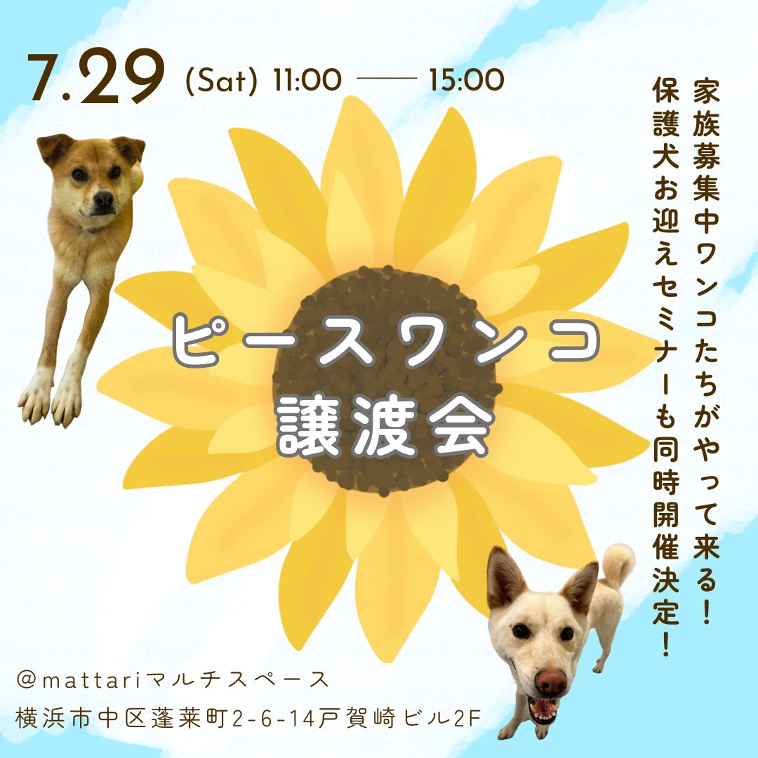 7月29日(土)、関内駅近くの「mattariマルチスペース」にて譲渡会を開催します。本会場は初開催となるピースワンコ譲渡会。世田谷譲渡センターから素敵な出会いを待ち望んでいる個性豊かなワンコたちが参加します!