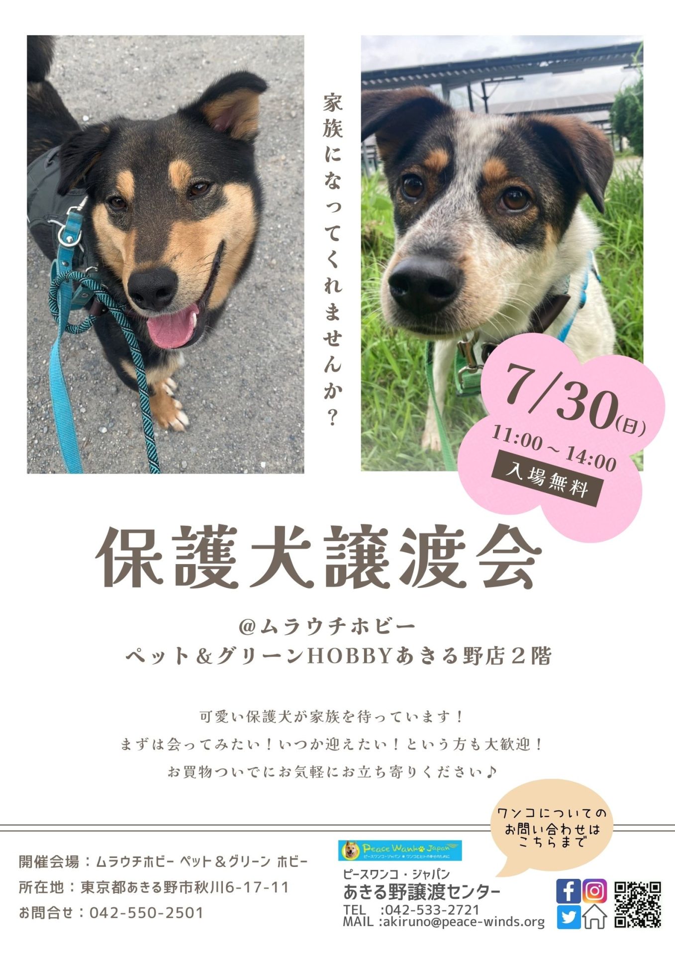 7月30日(日)、あきる野市内のお店の一角をお借りして「保護犬譲渡会」を開催します。あきる野譲渡センターで家族を待っているワンコ達が出会いを楽しみに参加いたしますので、ぜひ会いにいらしてください。