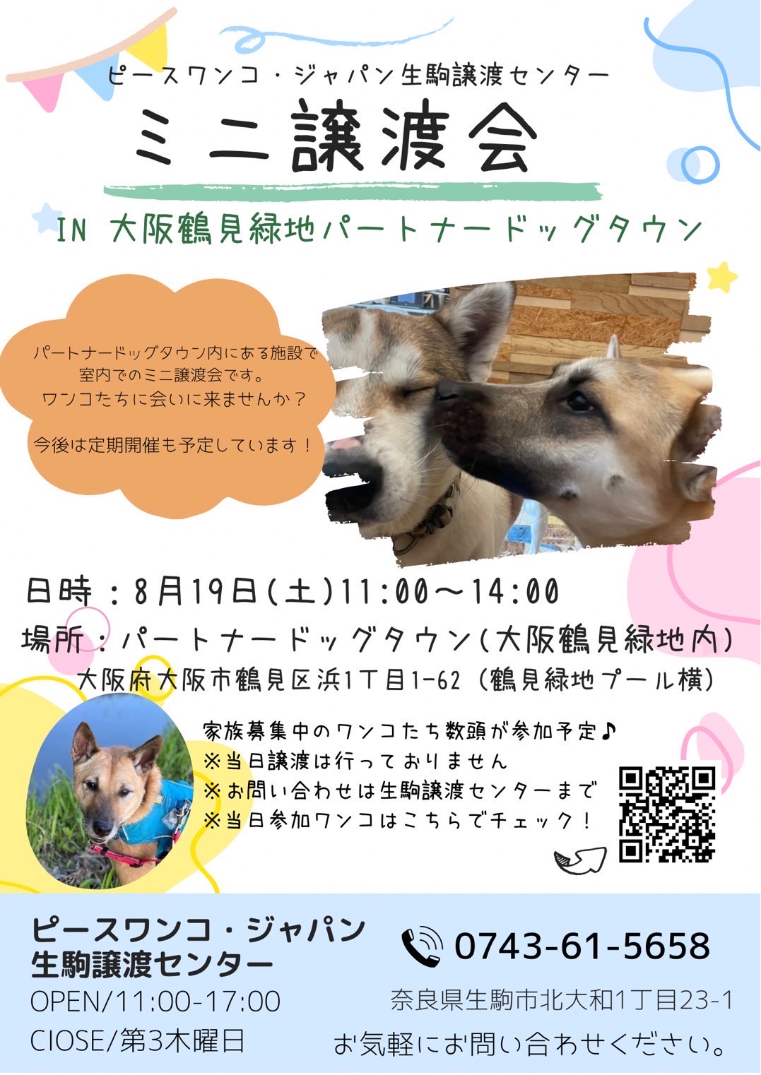 【ピースワンコの譲渡会】8/19(土)「ミニ譲渡会in大阪鶴見緑地パートナードッグタウン」開催(大阪/大阪市)