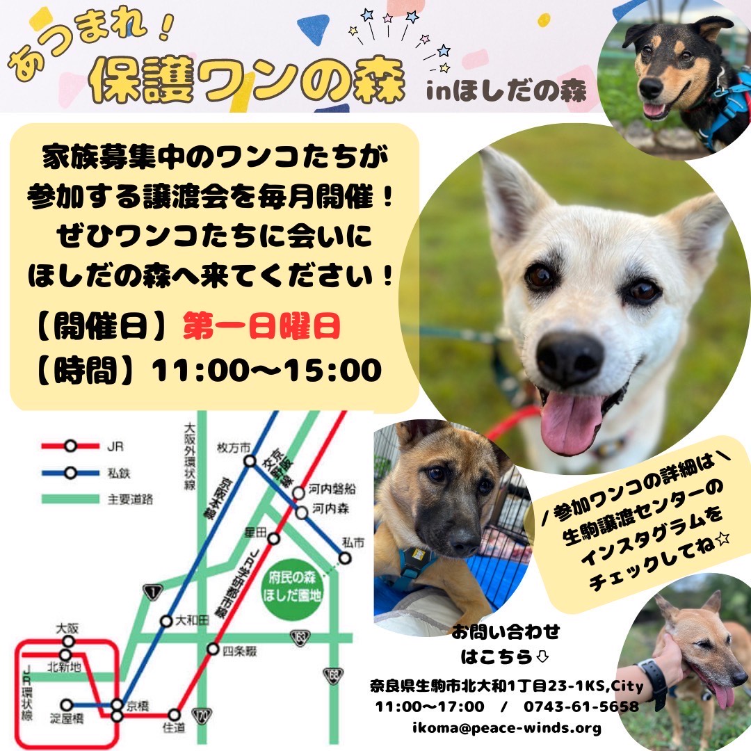 9月3日(日)、ほしだ園地にて定期譲渡会を開催します。生駒譲渡センターで家族を探しているワンコたちが参加いたしますので、ぜひ会いに来てくださいね! おうちのワンコの同伴も可能です。