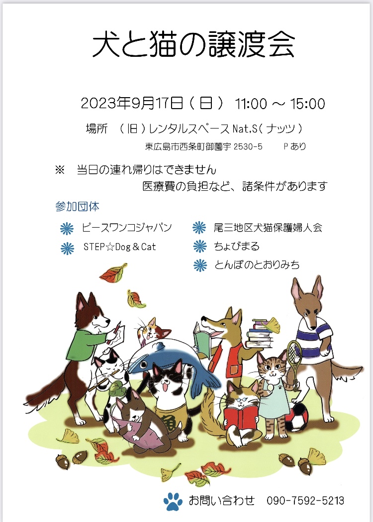 【ピースワンコの譲渡会】9/17(日)「犬と猫の譲渡会」に参加(広島/東広島市)