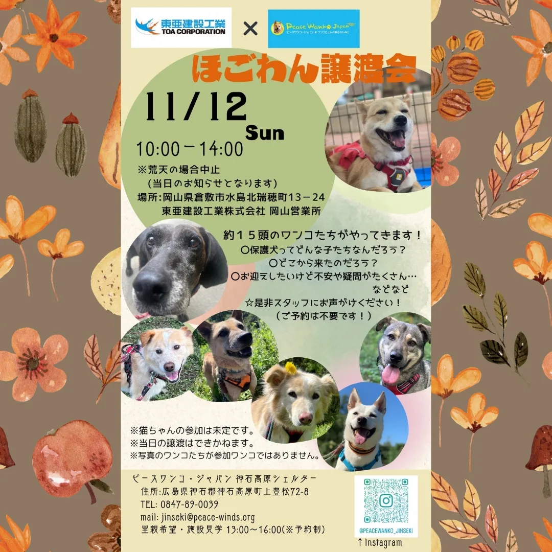 11月12日(日)、東亜建設工業株式会社様ご協力のもと、岡山営業所にて「ほごわん譲渡会」を開催させていただきます。