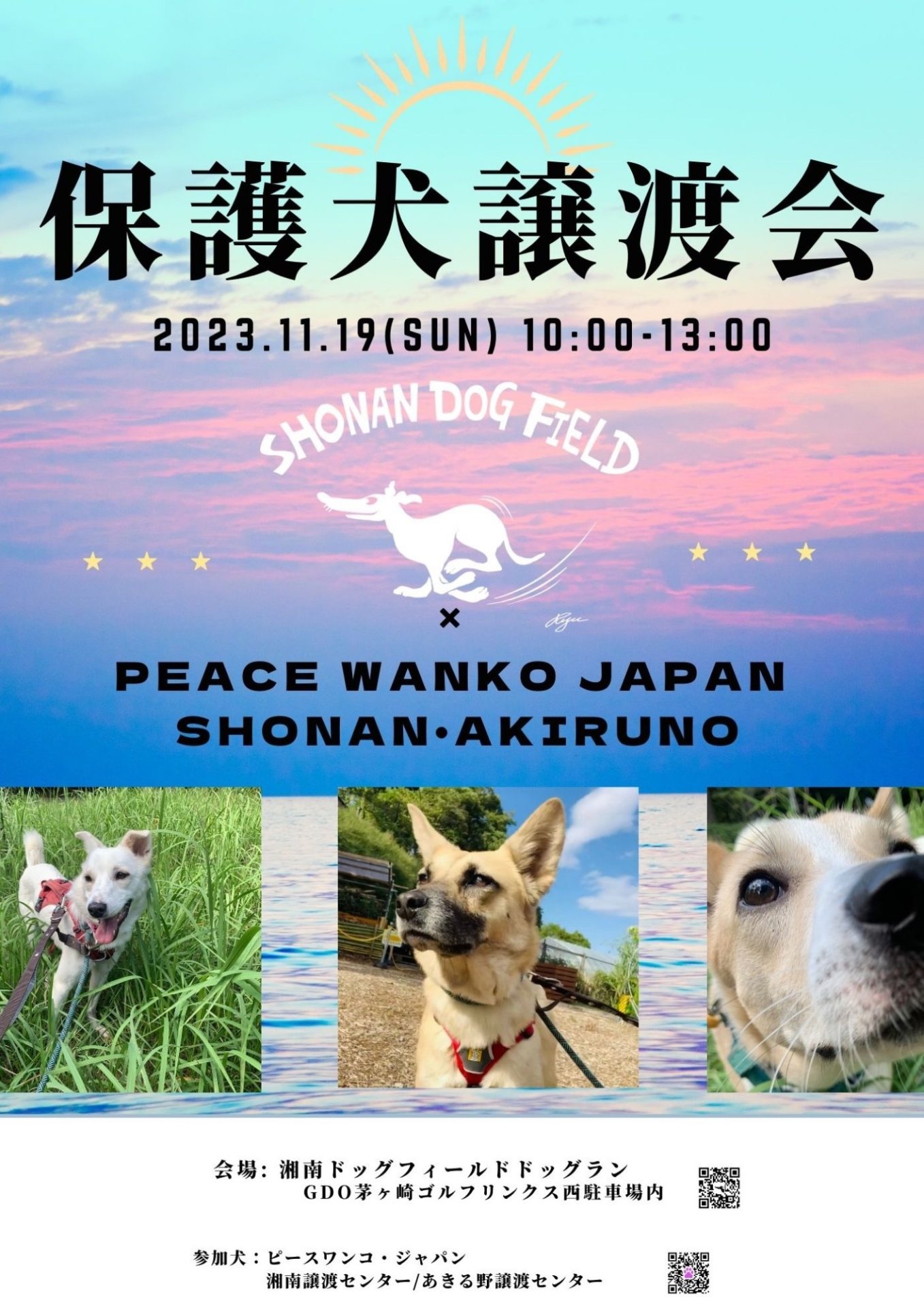 11月19日(日)、神奈川県茅ヶ崎市の「湘南ドッグフィールド・ドッグラン」にて「保護犬譲渡会」を開催させていただきます。湘南譲渡センター、あきる野譲渡センターで里親募集中のワンコが参加します。一頭でも多くのワンコが家族に出会えるよう、お近くの方はぜひご来場ください。