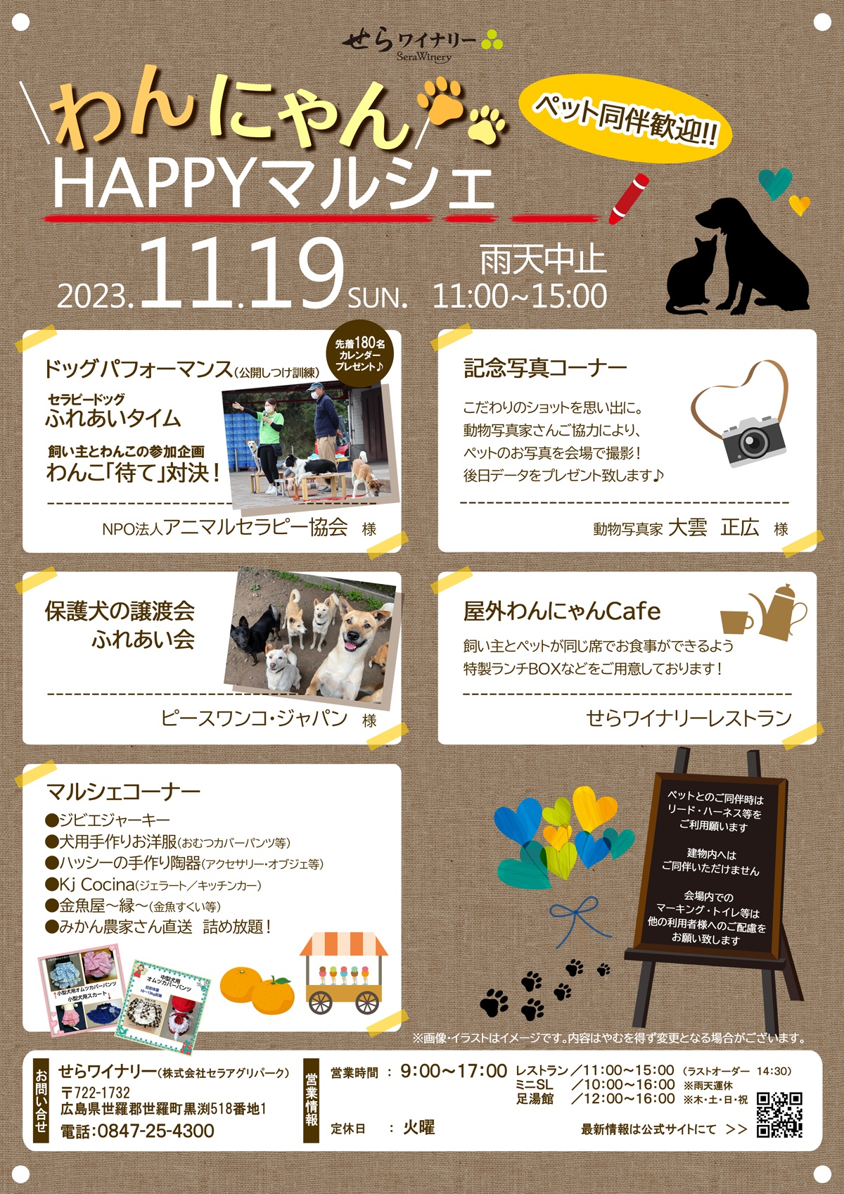11月19日(日)、広島県世羅町にあるせらワイナリー様にて開催される「わんにゃんHAPPYマルシェ」にピースワンコの保護犬たちも参加させていただきます。