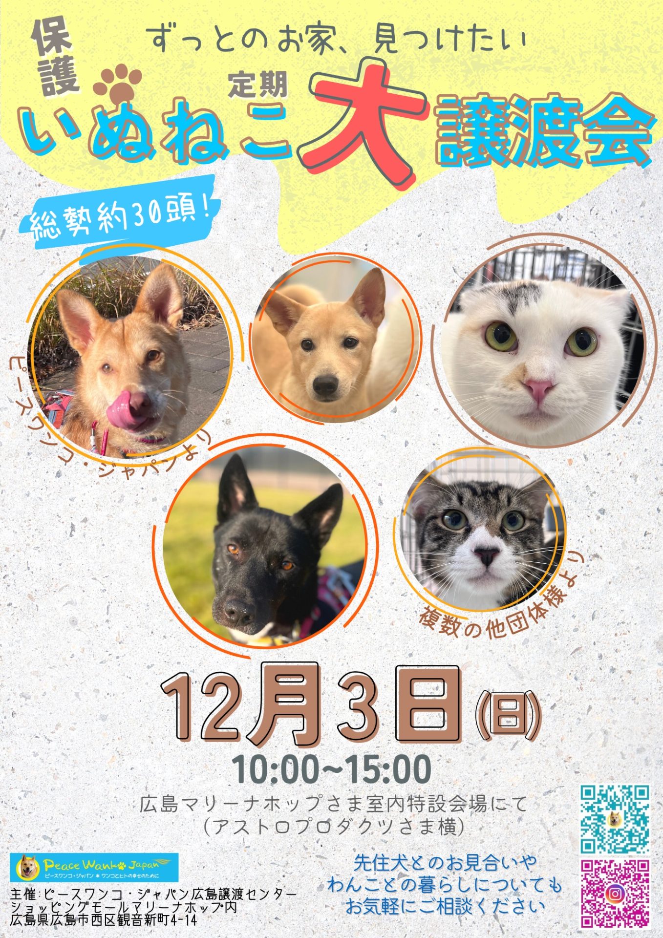 広島マリーナホップさまにて、定期的に「保護いぬねこのずっとの家族を探す会」を行います。