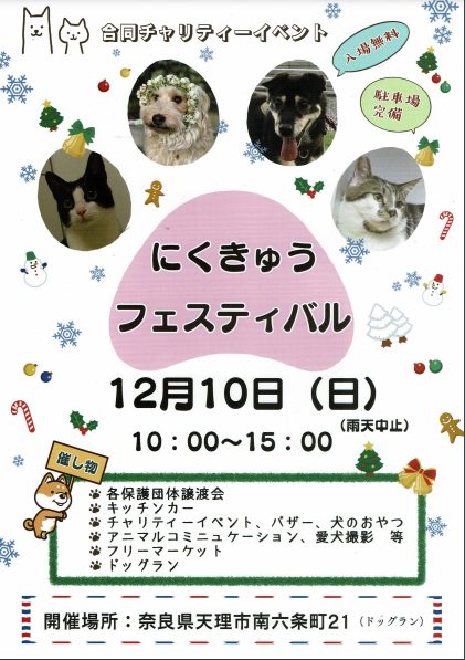 12月10日(日)に開催される合同チャリティーイベント「にくきゅうフェスティバル」に、譲渡会として参加させていただきます!