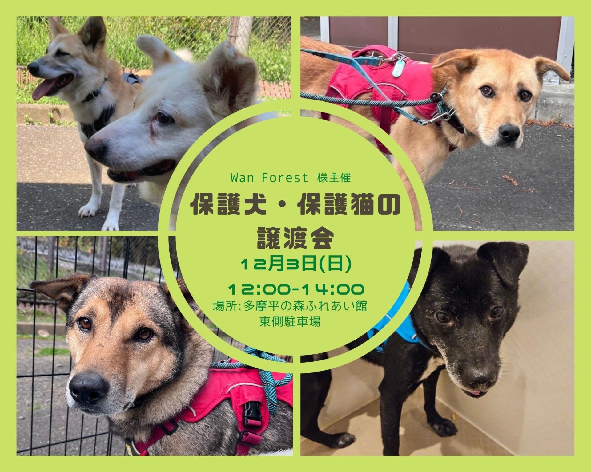 12月3日(日)、東京都日野市で開催されるWan Forest様主催「保護犬・保護猫の譲渡会」にあきる野譲渡センターで家族を募集しているワンコも参加させていただきます。ぜひワンコ達に会いに来てください。