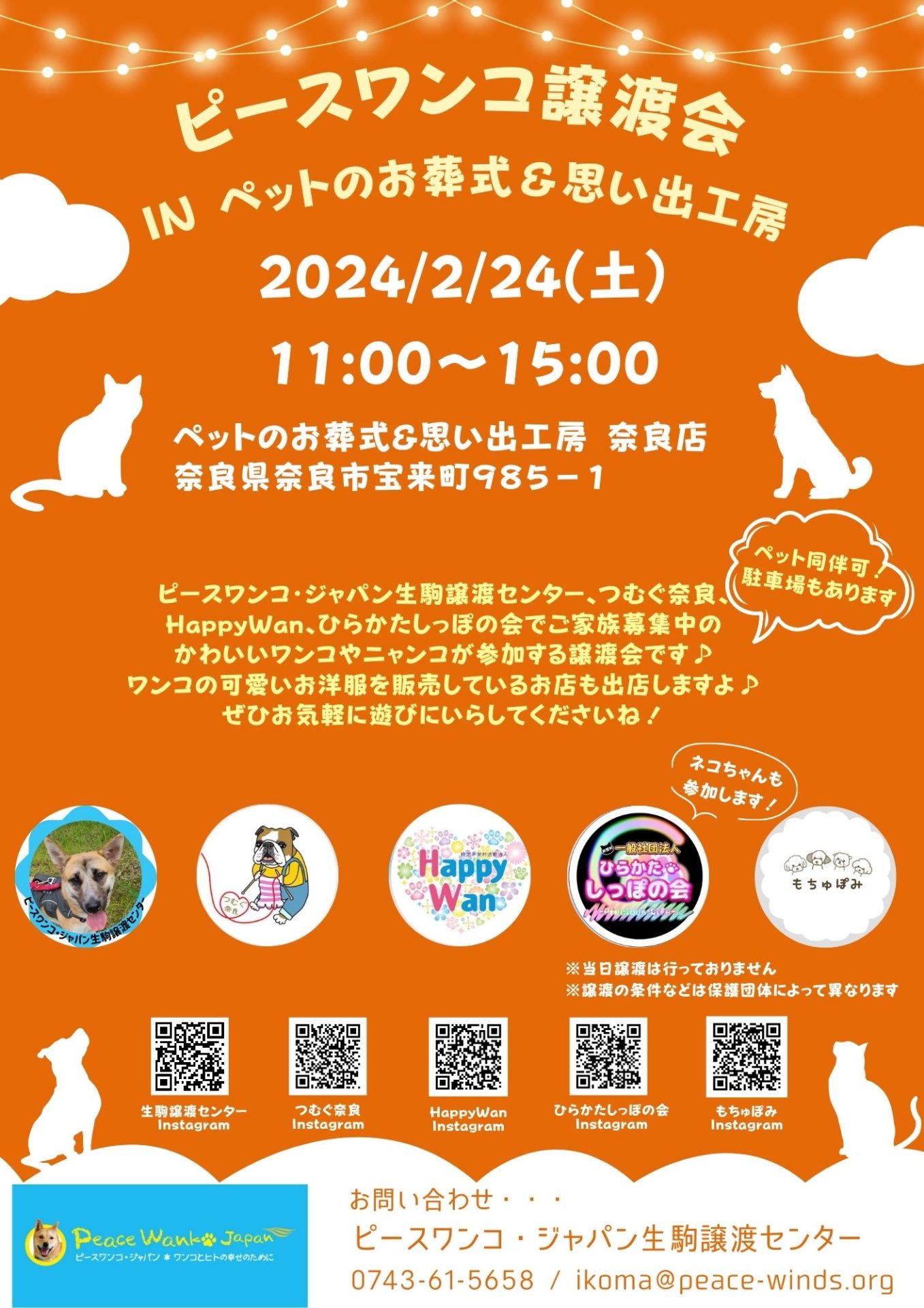 2月24日(土)、ペットのお葬式&思い出工房様にて、室内譲渡会を開催させていただきます。生駒譲渡センターで家族を探しているワンコたちが参加いたしますので、ぜひ会いにいらしてください。