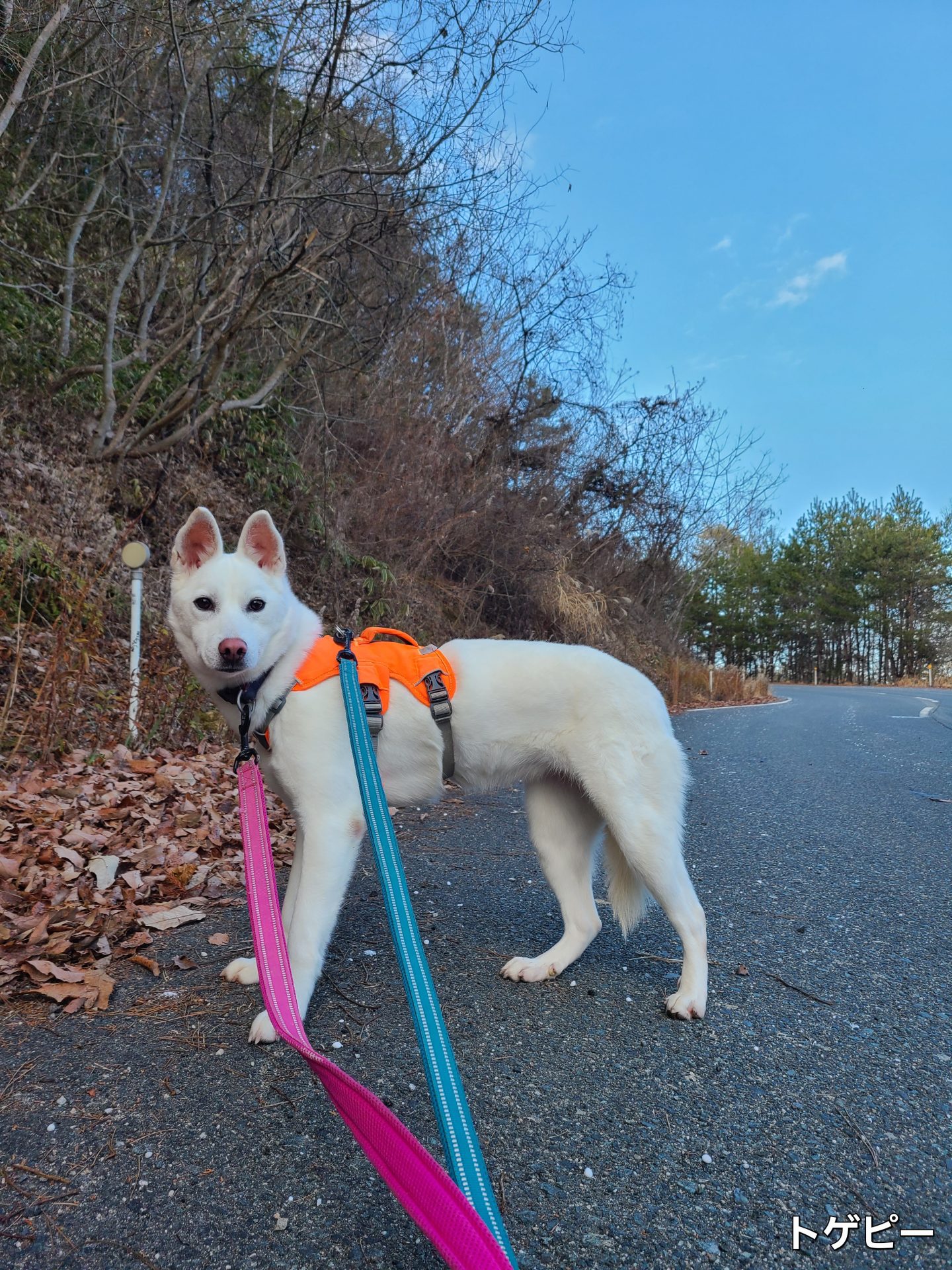 こちらも怖がりな性格の女の子です。お散歩は人の斜め後ろのほうをゆっくりと歩きます。まだトレーニング中なところもあり、
