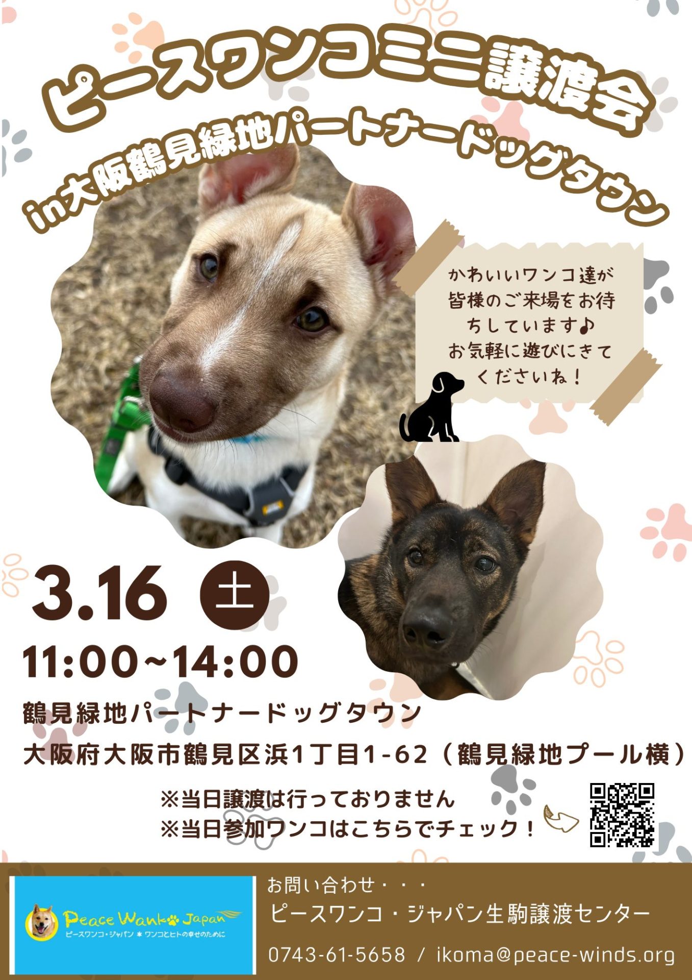 3月16日(土)、大阪鶴見緑地パートナードッグタウン内にある施設にて、室内でのミニ譲渡会を開催させていただきます。生駒譲渡センターで家族を探しているワンコたちが参加いたしますので、ぜひ会いにいらしてください。