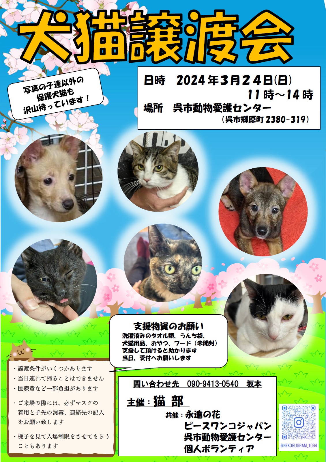 3月24日(日)、呉市動物愛護センターで開催される「犬猫譲渡会」に、ピースワンコの保護犬たちも参加させていただきます。