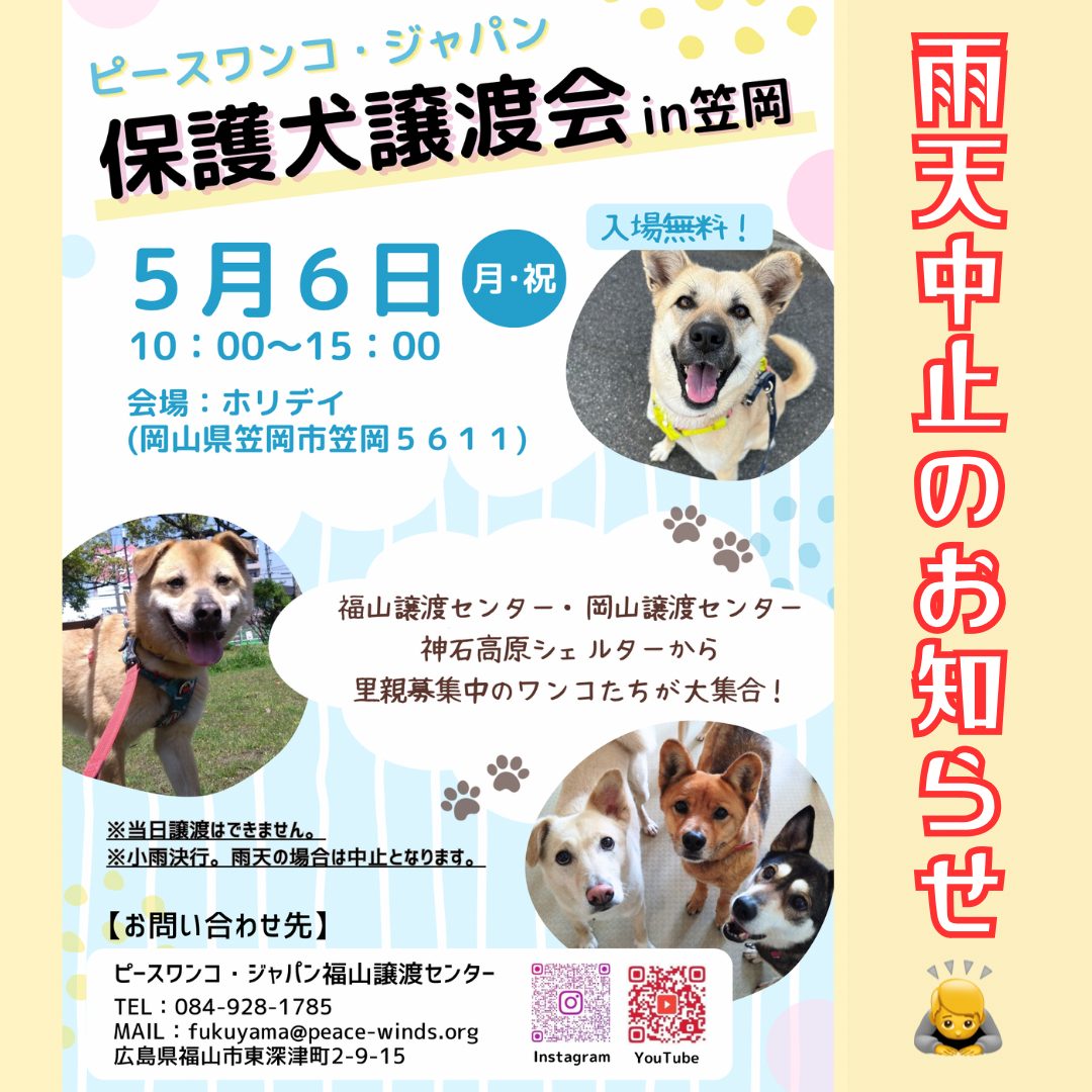 【雨天中止のお知らせ】5/6(月•祝)「保護犬譲渡会in笠岡」(岡山/笠岡市)