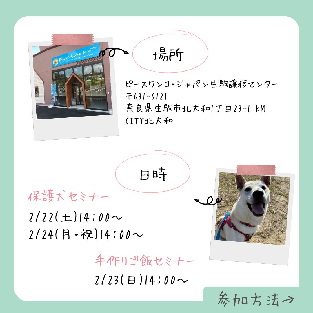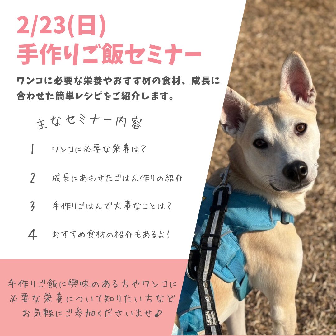 生駒譲渡センターにて、2025年2月22日(土)・2月24日(月・祝)に『保護犬セミナー』、2月23日(日)に『手作りご飯セミナー』を開催します♪