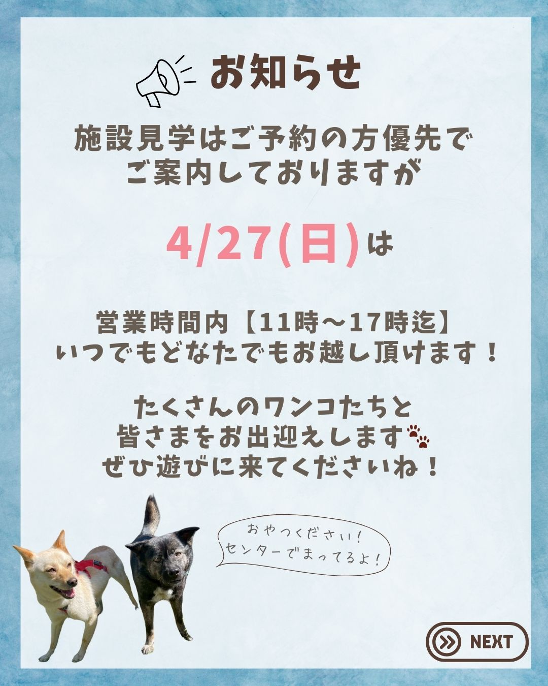 【ピースワンコのイベント】4/27(日)センター開放日「保護犬に会いに行こう!」(世田谷譲渡センター)