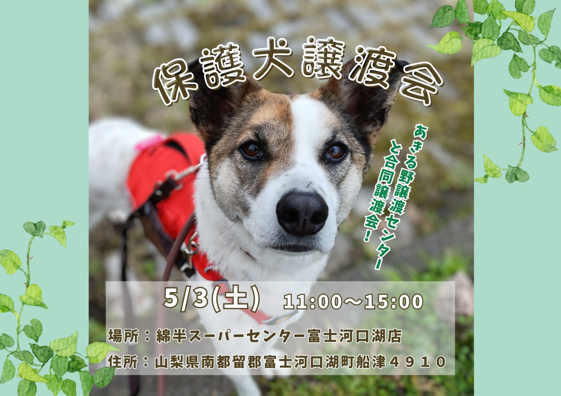 5/3(土)山梨県南都留郡にあります【綿半スーパーセンター富士河口湖店】にて保護犬譲渡会があり、そこで浜松譲渡センターも参加させていただきます!時間は11:00~15:00までです。あきる野譲渡センターと合同開催となりますので、2センター在籍のワンコと会えます!!そしてワンコにちなんだお店が大集合します♪ワンコが好きな方はもちろん、ワンコのお迎えをお考えの方、保護犬を知りたい方、今は飼えないけどいずれお迎えを考えているのでお話だけ聞きたい方、どんな方でもご来場していただけます。もし気になるワンコに出会えた場合はお散歩体験をさせていただくかもしれませんので、動きやすい服装でご来場いただけますと幸いです。保護犬との素敵なご縁を探しませんか?ぜひお友達やご家族を誘って皆様でお越しくださいませ。