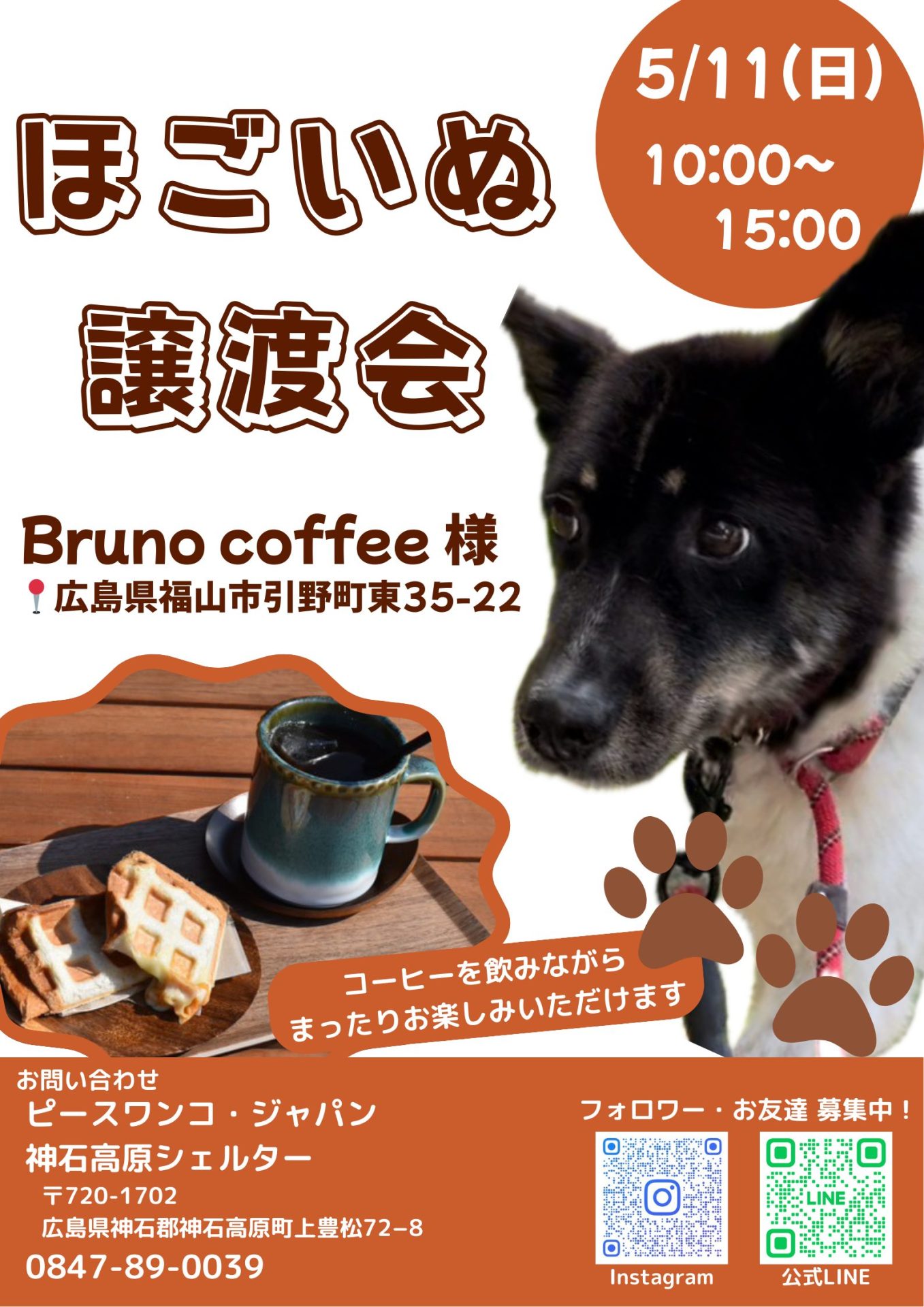 2025年5月11日(日)に、広島県福山市の『Bruno Coffee』様にて「ほごいぬ譲渡会」を開催します!