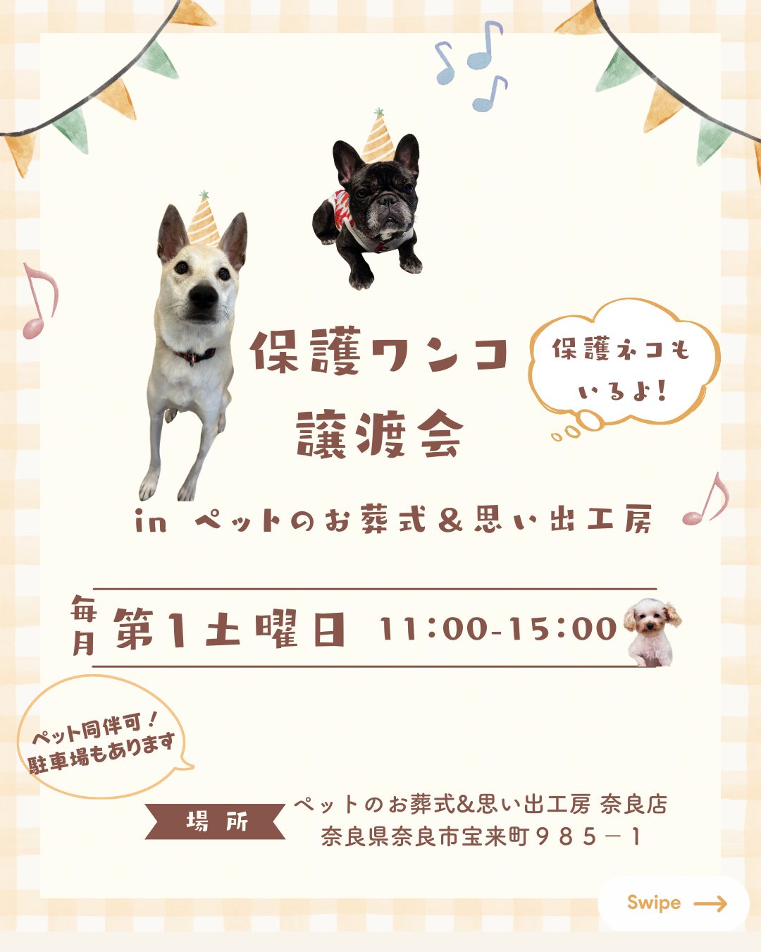 2025年6月7日(土)、ペットのお葬式&思い出工房様にて、室内譲渡会を開催させていただきます。生駒譲渡センターで家族を探しているワンコたちとかわいいワンコやニャンコのご家族を探している団体様が参加します。今回、参加する保護団体は『つむぐ奈良』さん、『にゃらとも』さんです。