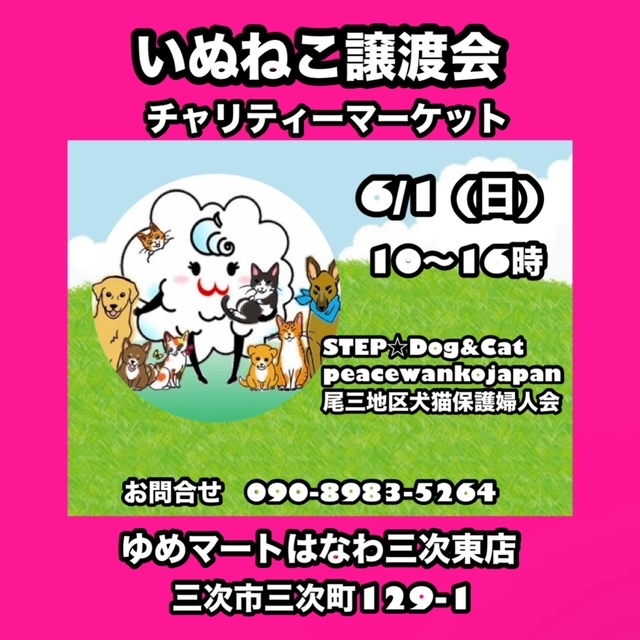 2025年6月1日(日)広島県三次市の「ゆめマートはなわ三次東店」様にて開催の「いぬねこ譲渡会」に