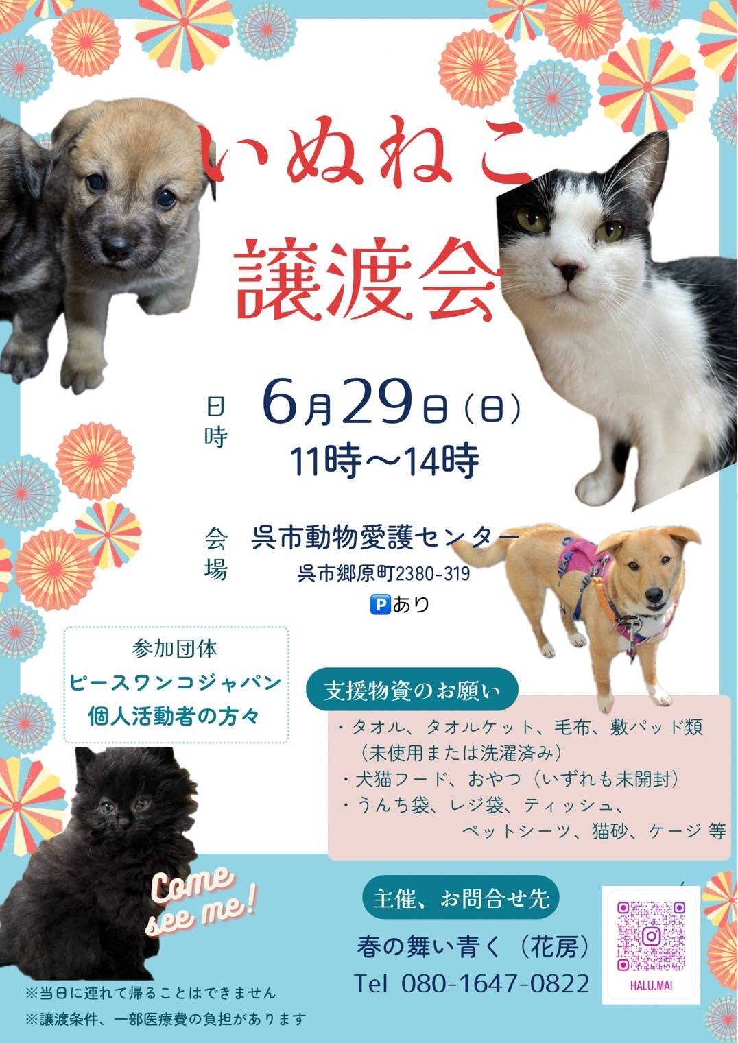 春の舞青く様主催で呉市動物愛護センターにて開催される「いぬねこ譲渡会」に、ピースワンコの保護犬たちも参加させていただきます。