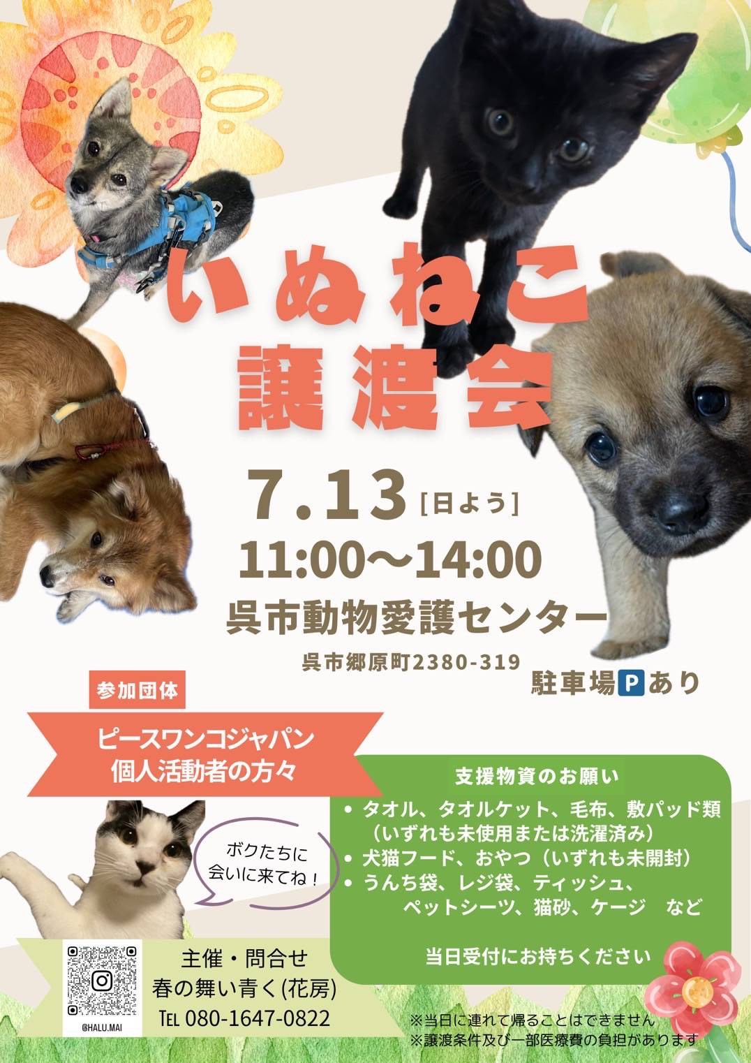 春の舞い青く様主催で呉市動物愛護センターにて開催される「いぬねこ譲渡会」に、ピースワンコの保護犬たちも参加させていただきます。