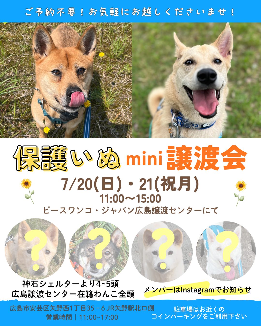 7/20(日)、21(祝月)の2日間、ピースワンコ・ジャパン広島譲渡センターにてmini譲渡会を開催いたします。