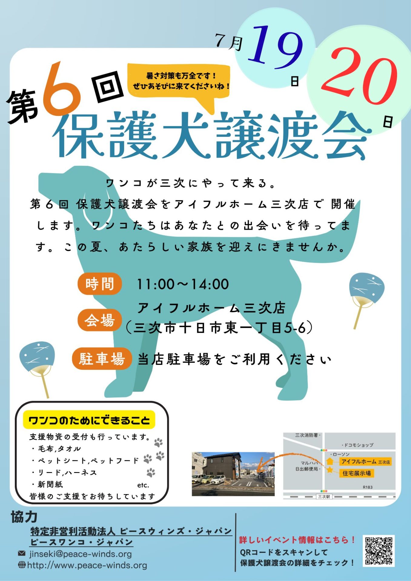 7月19日(土)、20日(日)アイフルホーム三次店様にスペースをお貸しいただき、「保護犬譲渡会」を開催させていただきます。