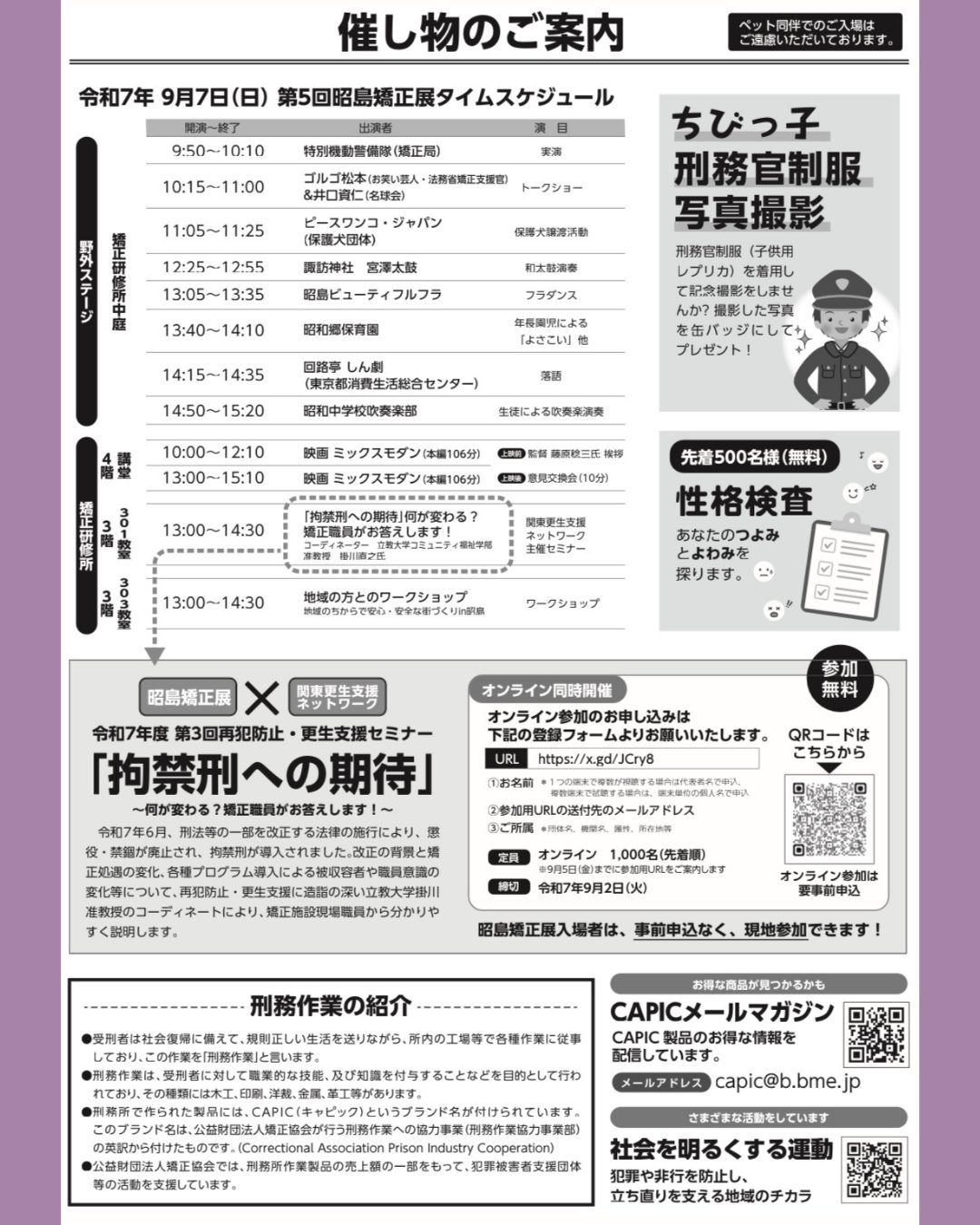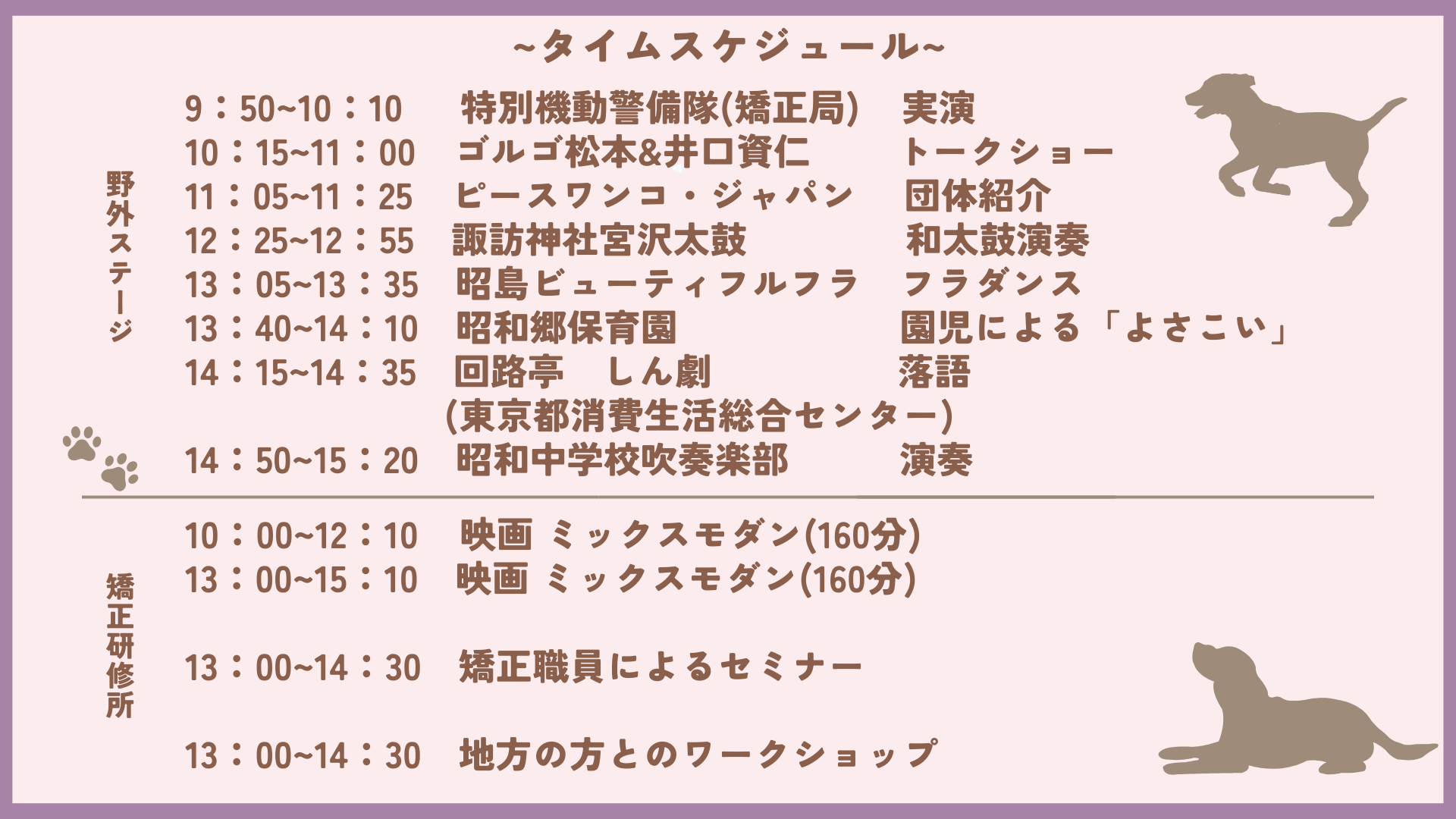 ワンコたちのふれあいはもちろん、ワークショップやステージイベント、刑務官体験など盛りだくさん!!