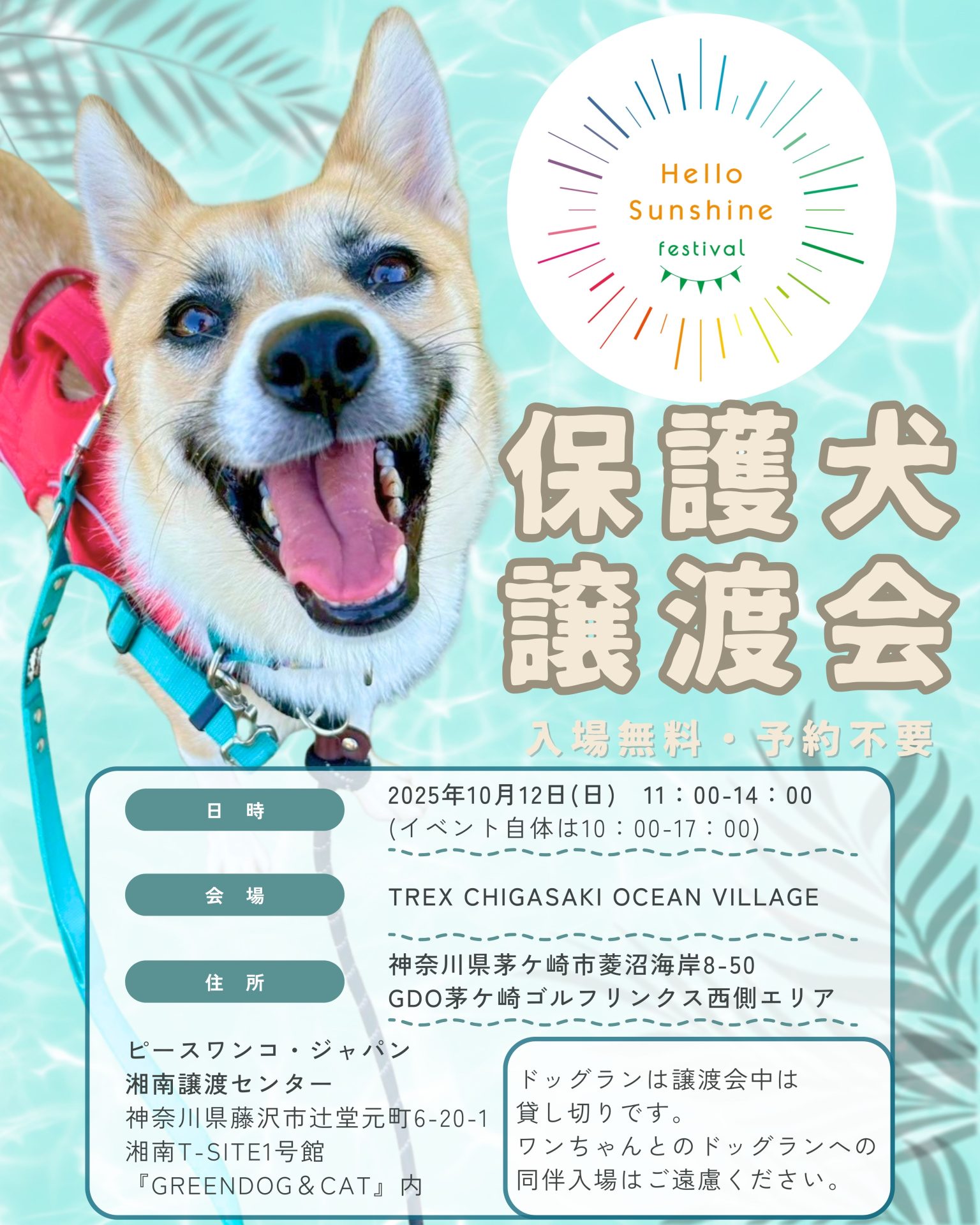 湘南譲渡センターの里親募集中のワンコが参加いたします。 一頭でも多くのワンコが家族に出会えるよう、ぜひご来場ください。