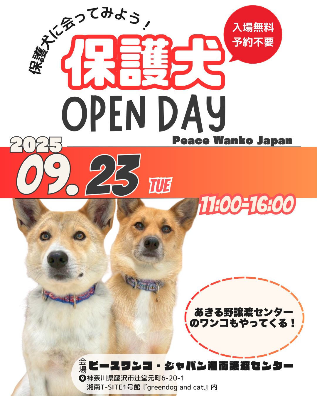 9月23日(火・祝)の11:00~16:00、湘南譲渡センターで「保護犬OPEN DAY」を開催します。