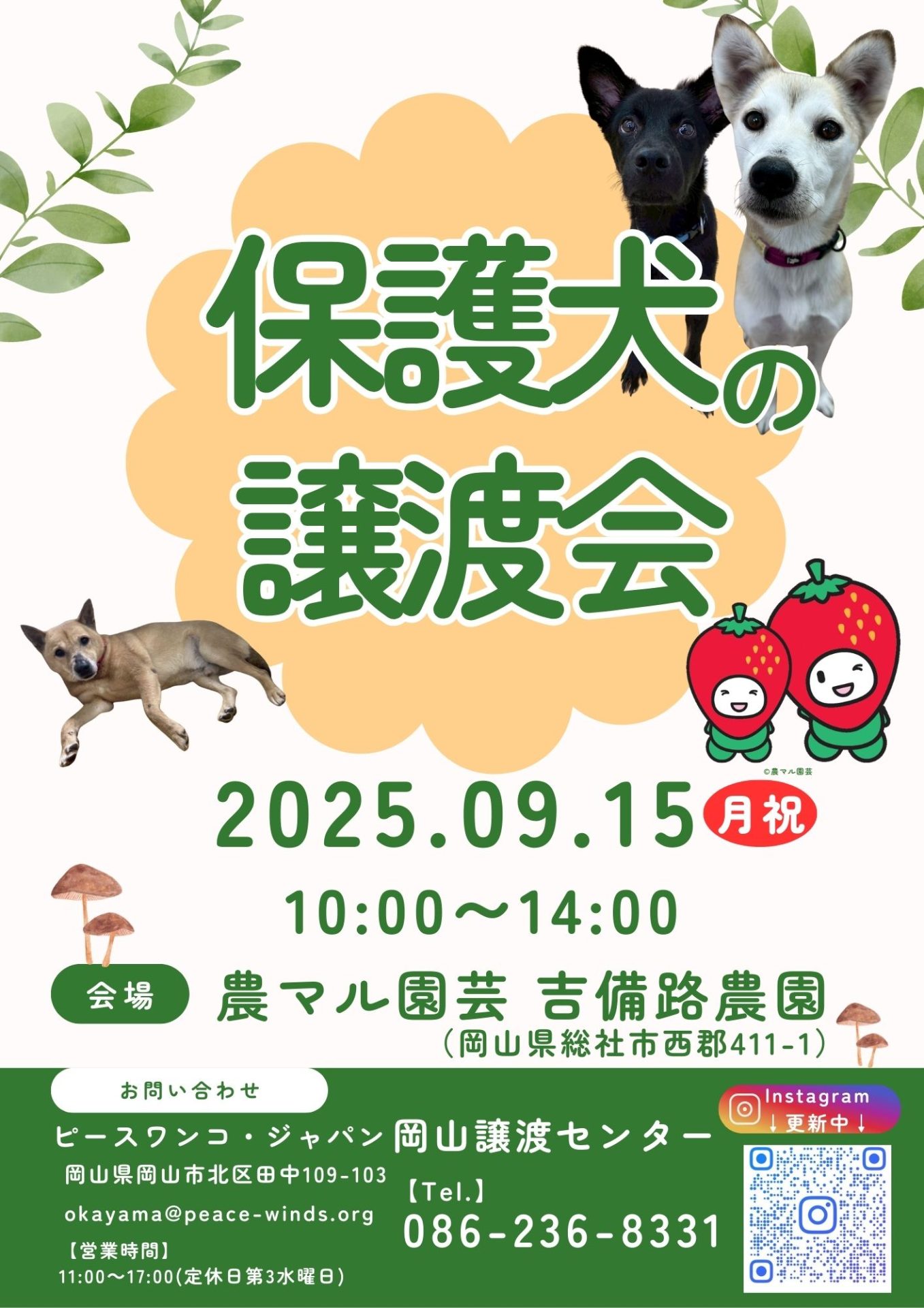 9/15(月祝)、岡山県総社市にある「農マル園芸 吉備路農園」様でピースワンコの譲渡会をさせていただきます。岡山譲渡センター初開催です!!