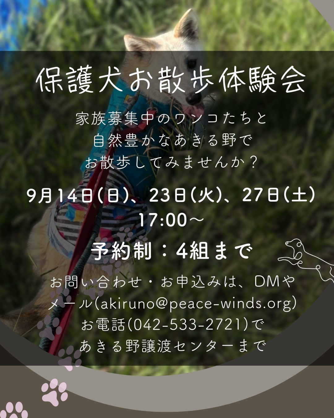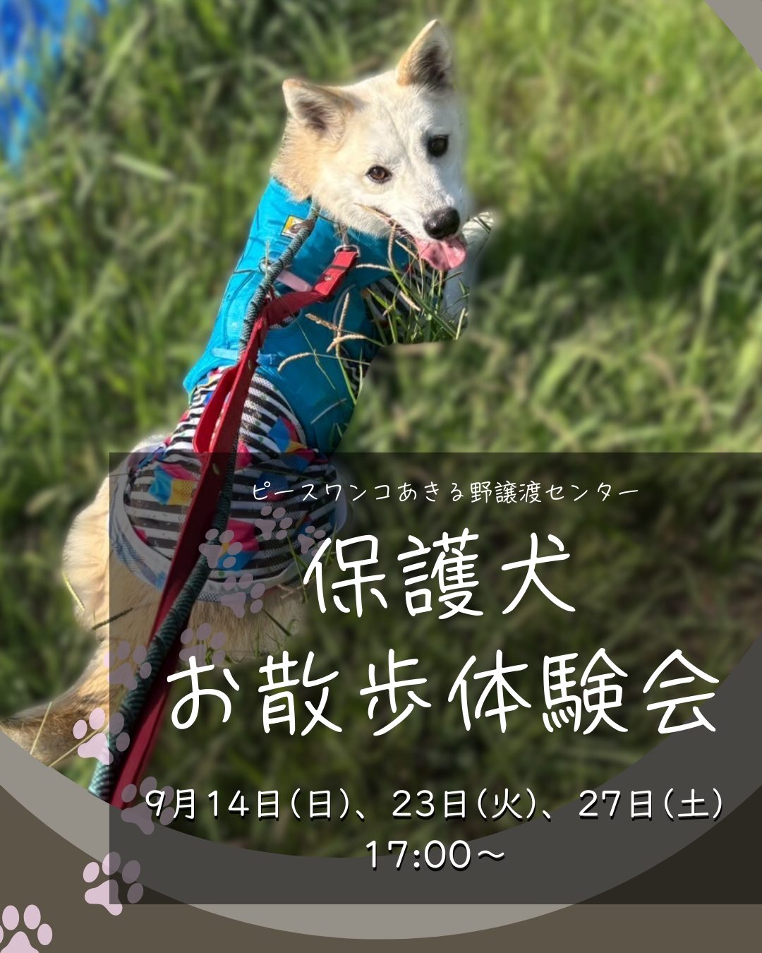 【ピースワンコのイベント】9/27(土)「お散歩体験会」を開催(あきる野譲渡センター)
