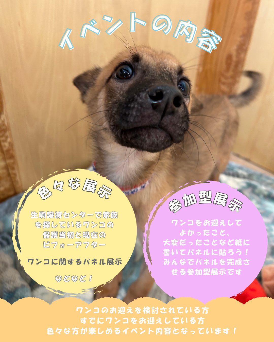 また、ワンコをお迎えして良かったこと大変だったことなどを紙に書いてみんなでパネルを完成させる参加型展示もおこないます。ぜひご参加ください♪
